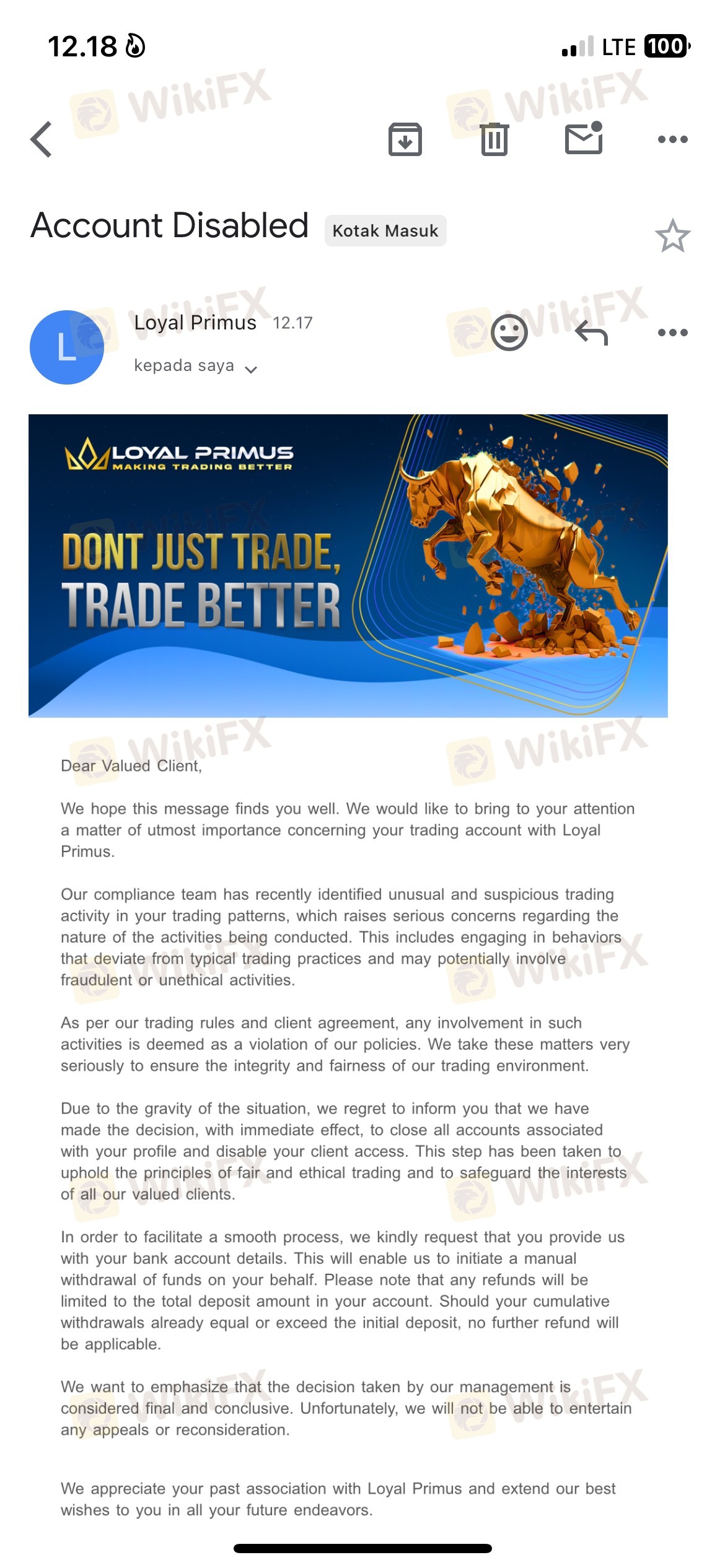 I traded at this broker with a deposit of 307$. Immediately after that I just traded normally. My trading was in the Xauusd pair with a layering lot of 0.03 with 10 layers. I sold in the 2420 area and I closed at around 2395, making a profit of around $875. Immediately the next day after making the payment details I withdrew all my money amounting to $1182.30 but immediately after that my account was disabled by LoyalPrimus. I hereby hope for the good faith of the LoyalPrimus broker to immediately pay all my withdrawals.