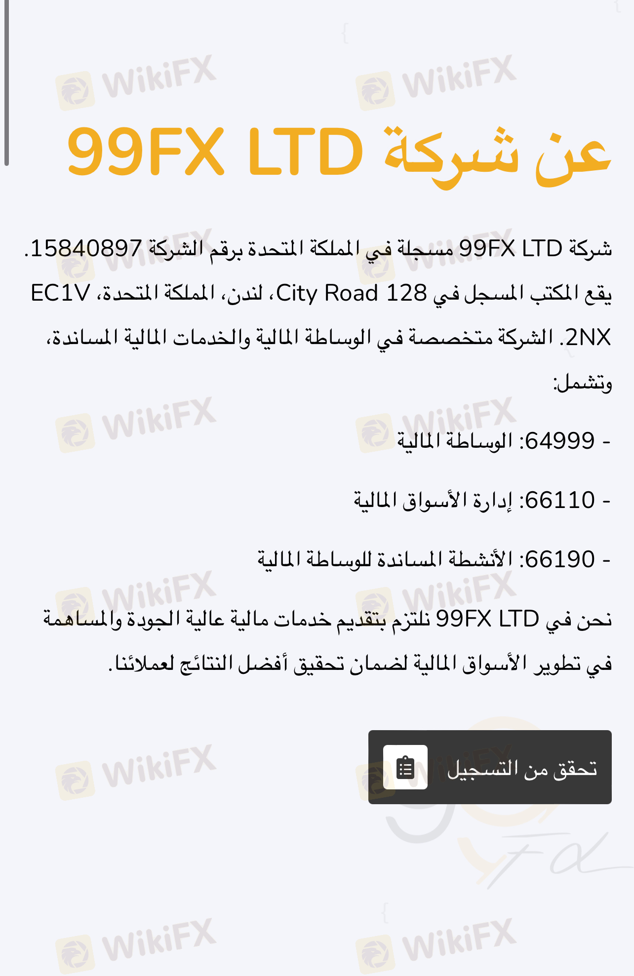 شركة 99FX LTD مسجلة في المملكة المتحدة برقم الشركة 15840897. يقع المكتب المسجل في 128 City Road، لندن، المملكة المتحدة، EC1V 2NX. الشركة متخصصة في الوساطة المالية والخدمات المالية المساندة، وتشمل: