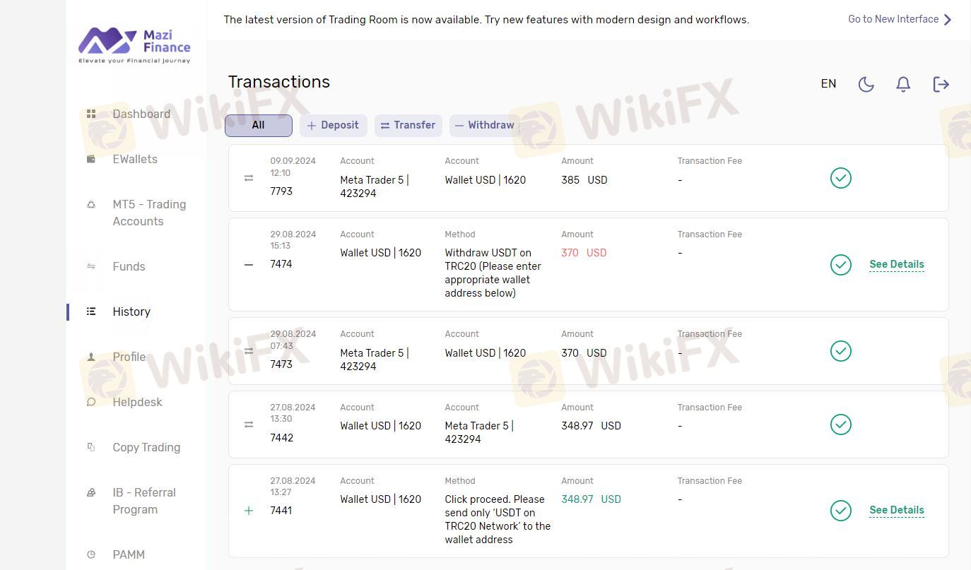 I was trading with Mazi for over a month. First withdarwal of my deposit they processed next day but now when I was asking for a 384 usd profit from my account 423294 they are not responding to my email and not proceeding with my request for over 2 weeks since 9th Sept 24. Hope they will sort this soon but so far this is my case