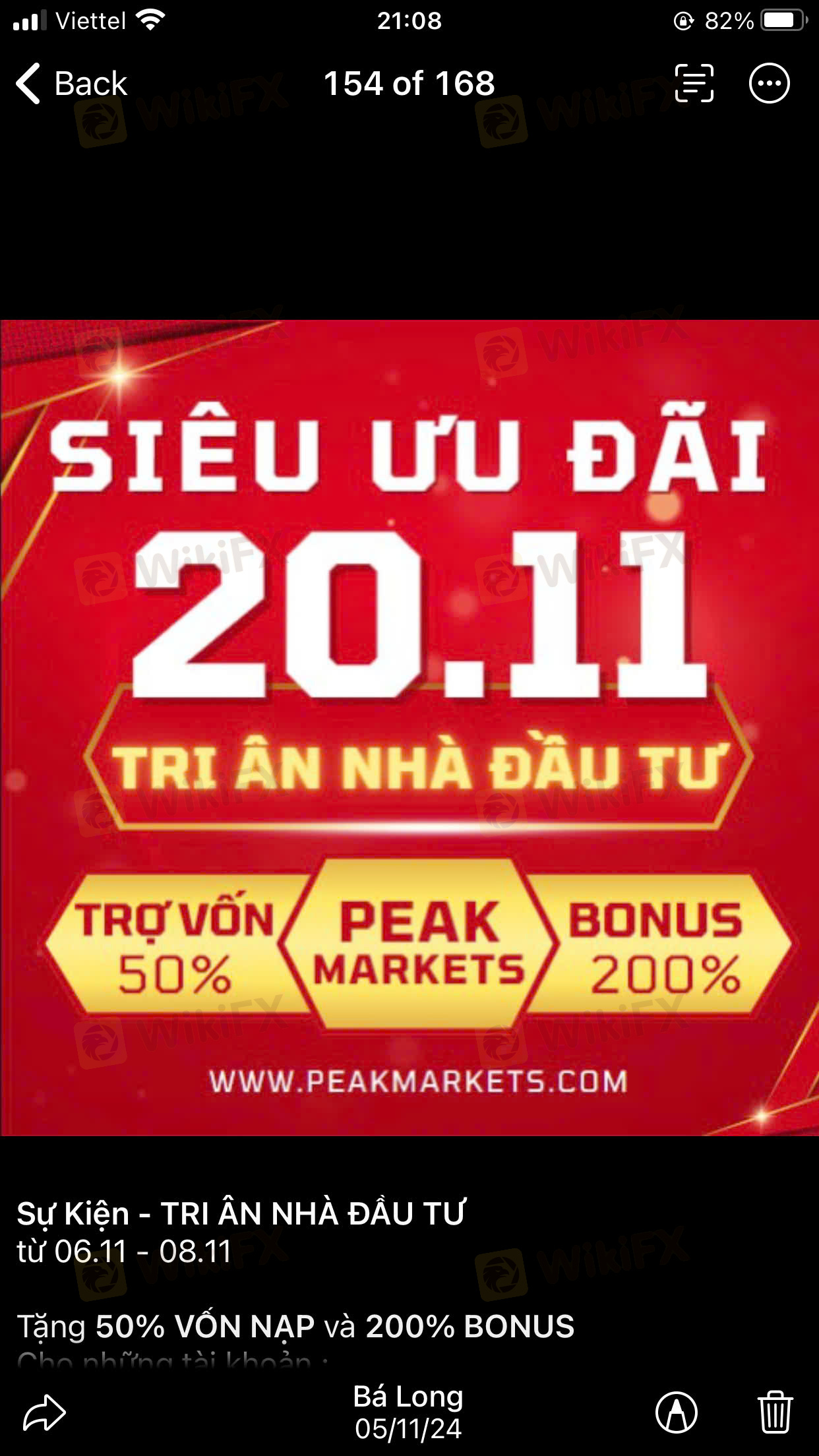 Tôi đầu tư sàn peak markets, người hỗ trợ tên Bá Long. Bạn này báo lỗi cổng nạp tiền, muốn nạp thì thông qua bạn ấy, tôi có gửi bạn ấy nạp 1000$ và hưởng bonus 500$ cộng vào tài khoản, nhưng khi tôi rút thì không nhận được khoản tiền 1500$ kia đâu. Khi tôi nhắn tin, gọi điện để xin lại số tiền kia thì Bá Long không trả lời, xóa lịch sử và chặn. Mọi người tránh xa sàn không uy tín, nhân viên hỗ trợ ăn chặn tiền của khách này nhé!