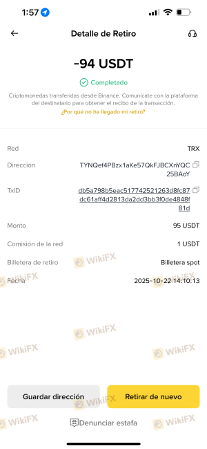 Realicé un depósito de 94 USDT (TRC20) el 22 de octubre de 2025, desde mi billetera Binance hacia la dirección generada por Exnova