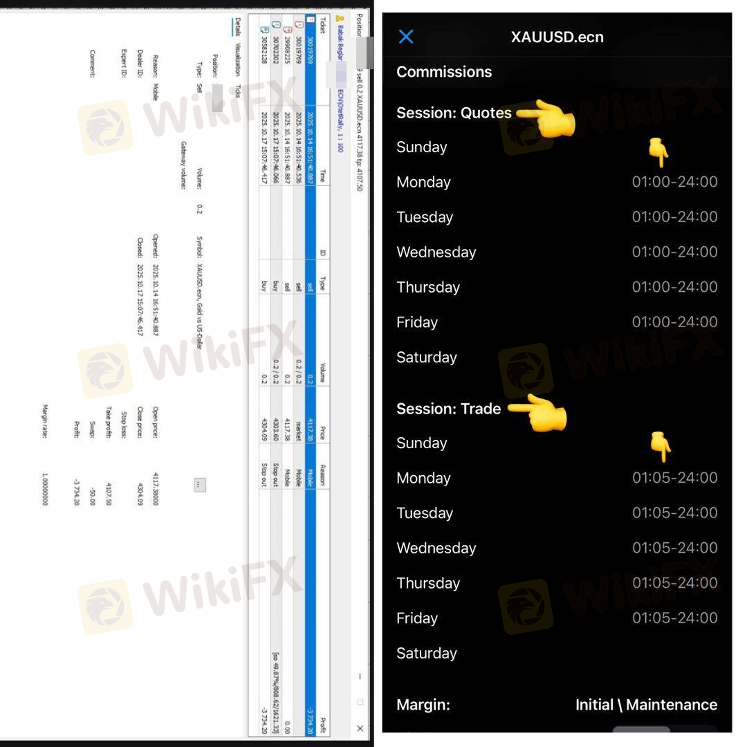 2. **EXPLOITATIVE ACTION:** At 01:00, I maintained a robust **$860 margin** and was ready to **HEDGE**, but the platform explicitly **BLOCKED** trading (Session: Trade closed), while allowing the price feed (Session: Quotes active) to drain my margin for 5 minutes.