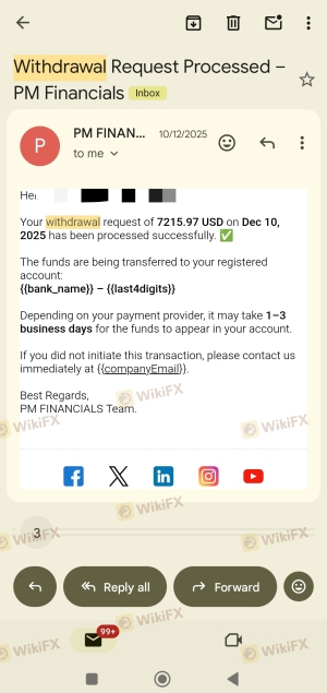 hii, I'm writing this because I was scammed by the pm financial. I deposit in my fully verified account. the account manager neeraj asked me to deposit. and I made 5k approx profit. when I withdraw I got approved mail . but after 40+days still now I don't get my funds. and the person called vise precident beg for deposits and never pay you back . this is true story. they scamming many people. here Im attaching proofs. I completed on fsc but there is no response from the regulation. so don't trust them . I'm taking this issue to civil law . I will arrest them all soon .