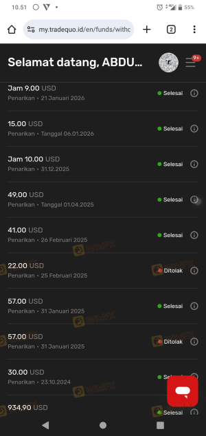 Penarikan di TradeQuo aman tidak ada masalah dan sangat cepat masuk ke akun bank ,saya harap TradeQuo bisa berjangka panjang dan legalitas nya di perkuat agar semakin baik dan banyak trader yang berdagang di TradeQuo.