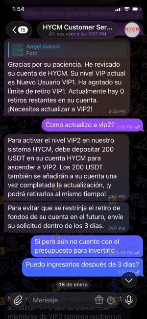 DENUNCIÓ A HYCM CAPITAL MARKETS POR EL ROBO DE 2,000$ DOLARES YA QUE ME AH BLOQUEADO MIS RETIROS ME ESTÁN PIDIENDO UNA CANTIDAD DE 200$ DOLARES PARA DESBLOQUEARME SUPUESTAMENTE EL NIVEL (VIP2) PARA QUE ME DESBLOQUEEN LOS RETIROS ANTERIORMENTE REALIZE EL DEPÓSITO DE 206$ DOLARES PARA QUE ME DESBLOQUEARAN LA CUENTA Y ME CAMBIARAN A EL NIVEL VIP2) Y AL REALIZAR EL DEPÓSITO ME COMENTAN EN SOPORTE DE HYCM QUE NO SE PUDO ACTUALIZAR MI NIVEL A VIP2) POR EL MOTIVO QUE LA CANTIDAD ESTÁBA INCORRECTA ALA QUE SE ME PIDIÓ QUE SE DEPOSITARA QUE ELLOS NO PUEDEN HCER NADA AL RESPECTO Y ME PIDEN QUE DEPOSÍTE OTROS 200$ DOLARES MAS PARA QUE SE PUEDA DESBLOQUEAR LOS DEPÓSITOS DE MI CUENTA LES COMENTÉ QUE YA NO CONTABA CON MÁS CAPITAL PARA REALIZAR EL DEPÓSITO DE OTROS 200$ DOLARES Y SOLAMENTE ME COMENTARON QUE NO PODIAN HACER NADA YA QUE EL “SISTEMA” ES AUTOMÁTICO Y QUE DETECTA EXACTAMENTE SOLO 200$ DÓLARES.