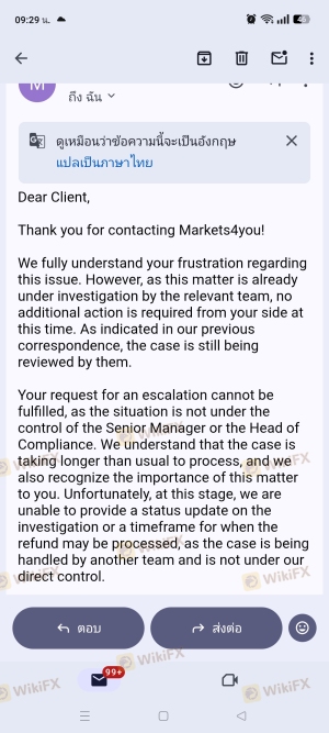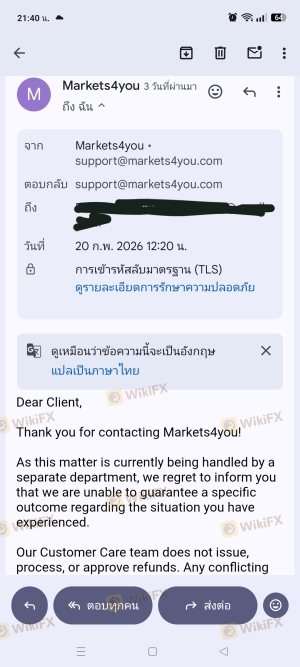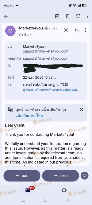 ฉันได้เปิดออเดอร์ Sell ไว้ ในตอนนั้นกราฟวิ่งขึ้นแรง ฉันจึงกดคัทไปบางออเดอร์ เพื่อรักษาพอร์ตไว้ แต่กดไม่ได้ ตอนนั้นไม่แน่ใจว่าเป็นที่อินเตอร์เน็ตของฉันหรือระบบของโบรค จึงโทรหาเจ้าหน้าที่ของ markets4you เพื่อขอความช่วยเหลือ เจ้าหน้าที่เช็คให้แล้วบอกว่าออเดอร์ฉันได้ถูกปิดหมดแล้ว ฉันตกใจมากเพราะต้องการคัทแค่บางออเดอร์เท่านั้น ฉันจึงเข้าไปดูในพอร์ต แต่ปรากฏว่า ออเดอร์ยังเปิดอยู่ทั้งหมดและไม่ว่าจะโทรกี่ครั้ง เจ้าหน้าที่ก็ยังยืนยันว่าออเดอร์ถูกปิดหมดแล้ว ซึ่งตอนนั้นกราฟอยู่ที่ 5,400 จนกระทั่งเวลาผ่านไปกราฟลากไป 5,600 ทำให้ฉันถูกล้างพอร์ต ฉันติดต่อเจ้าหน้าที่อีกครั้ง ซึ่งเป็นเจ้าหน้าที่ผู้หญิงรับสาย เจ้าหน้าที่แจ้งว่าก่อนหน้านี้ระบบมีปัญหา ให้ฉันทำเรื่องขอเคลมเงินคืนได้ หลังจากนั้นกราฟย่อตัวลงมาเยอะ ซึ่งถ้าฉันคัททันตอนนั้นพอร์ตจะไม่ถูกล้างและอาจจะได้กำไรด้วย ฉันยื่นเรื่องตั้งแต่วันที่ 29 มกราคม 2569 จนวันนี้วันที่ 24 กุมภาพันธ์ 2569 ระยะเวลาเกือบ 1 เดือนเมื่อส่งอีเมลทวงถามก็ไม่ได้รับความคืบหน้า เหมือนโบรคต้องการยื้อเวลาไปเรื่อยๆ และไม่มีกรอบระยะเวลาที่แก้ปัญหาหรือระยะเวลาที่จะคืนเงิน