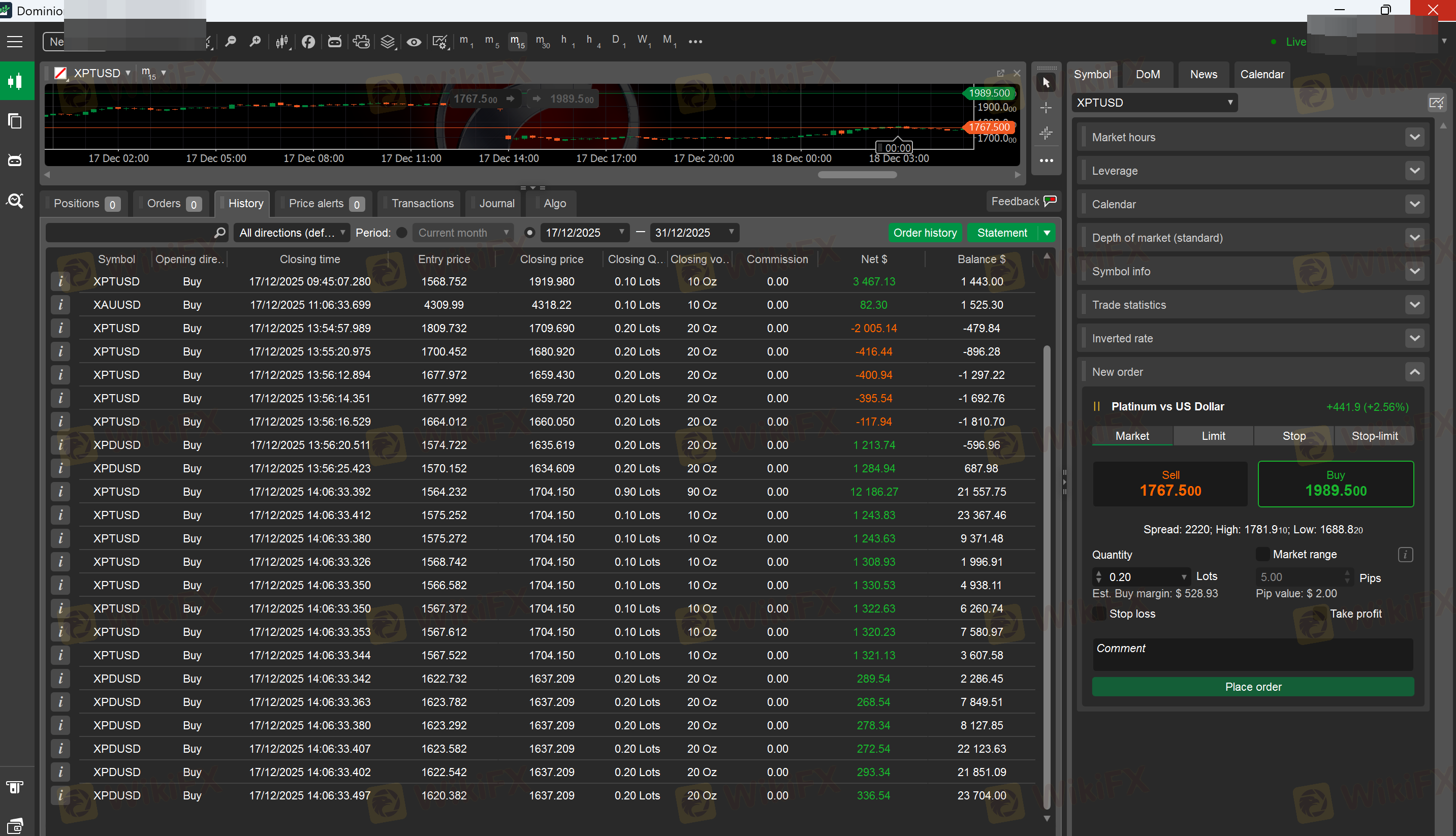 I was a verified client of Dominion Markets since November 25, 2025. My trading was going well; I went long XPTUSD and XPDUSD and watched my account grow. But on December 17, 2025, they logged into my trading account and closed my winning trades themselves, increasing the spread by $200 on XPTUSD. The actual closing price should have been around $1,911, but they closed my positions at $1,660-$1,704. They also closed my account. Because of this, I lost $67,310. They didn't notify me of this; instead, I messaged them all day, but they ignored me. I believe they did this intentionally to steal my profits. I have screenshots to prove this. There are also many negative reviews about their activities, including how they block accounts and prevent people from withdrawing their funds. I recommend everyone stay away from this company to avoid giving a penny to these scammers. How can they be held accountable?
