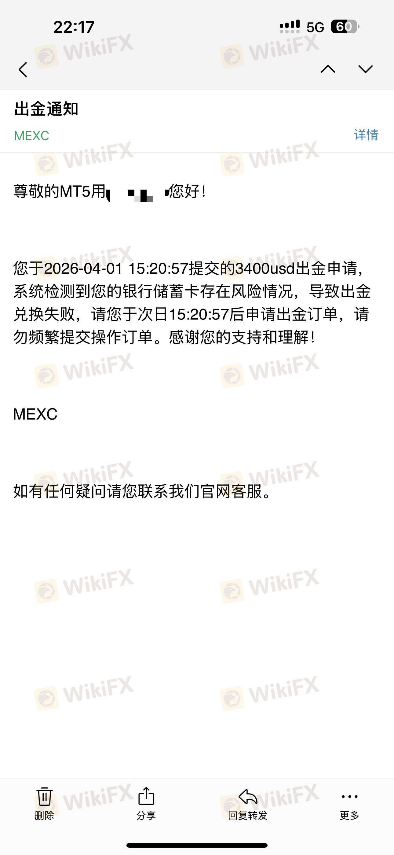 我在MasterMind Capitals平台开户交易 mt5账号:52**** 服务器:MasterMindCapitals-Server 入金总额:约7000美元 申请出金金额:13700美元 我第一次出金成功出金过1500美元。第二次申请出金3400美元时,平台以"银行卡异常"为由拒绝审核。随后再次申请出金13700美元,平台又以"节假日""银行卡异常"等理由一直拖延,至今未处理。客服多次推诿,我的出金申请迟迟没有结果。