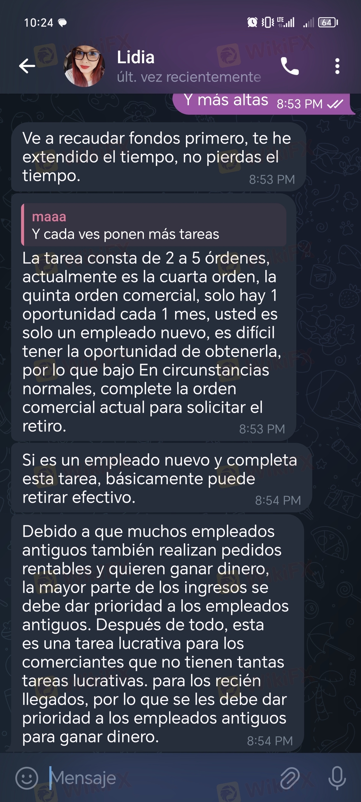 You receive a message on WhatsApp telling you that they will give you a job and you will earn 60 to 10000 daily, but it's a lie. They give you 60 for a task and then you have to complete tasks with your own money. I lost 12500 and they wanted 35500 more. I asked for a withdrawal of the money, but they only tell you to get more, that you have to finish and they don't return your money. They play with the little that hardworking people have and with their needs. They left me in debt because of that money and it's not fair. It's not right for them to play with people like that, especially when someone does it out of necessity. But here I leave the evidence of how they work to commit fraud. I hope I could recover the money. Here are these images.