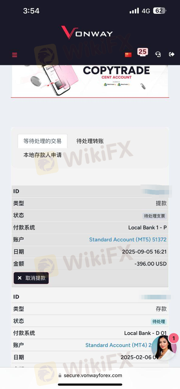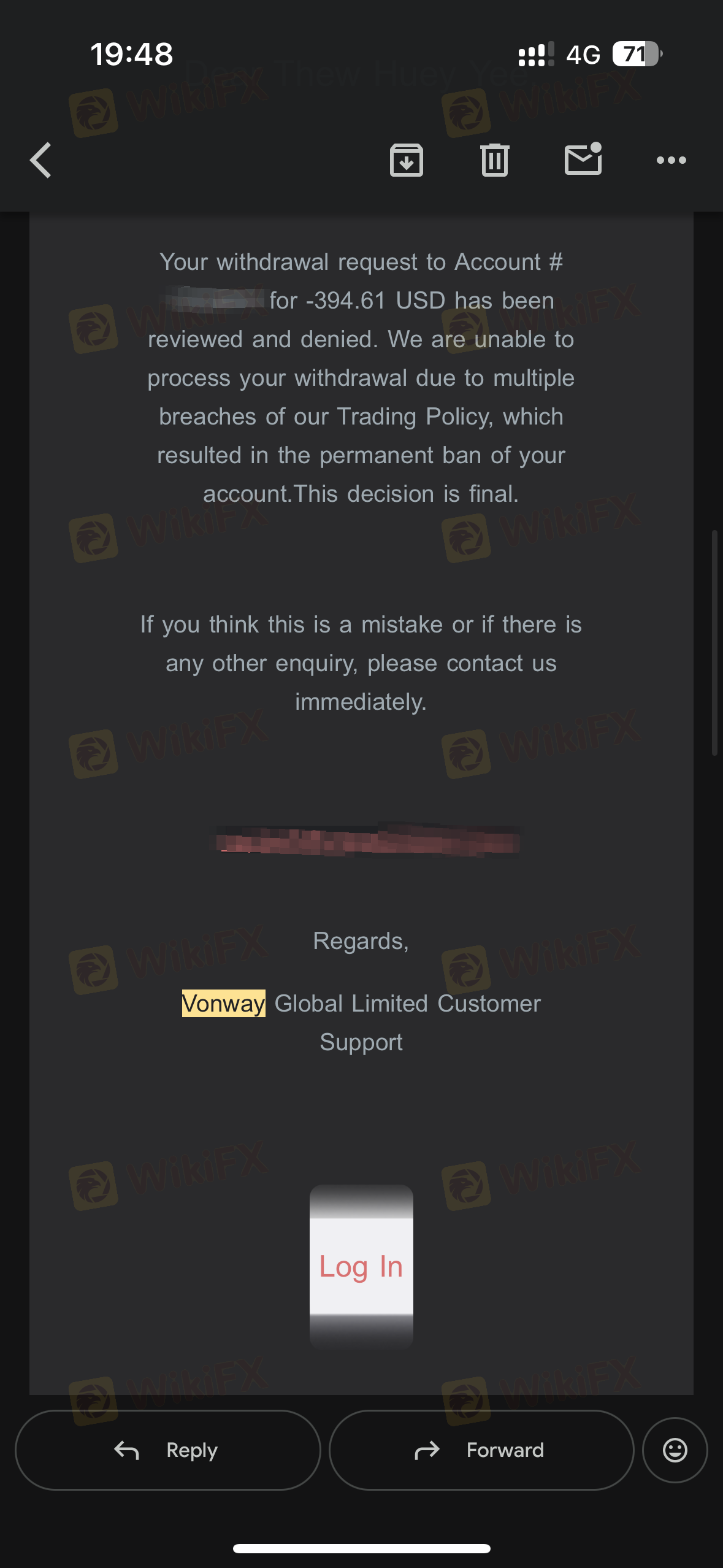 If it was this kind of fraud, I tried to withdraw $50 into my account, but it took a long time. In the case that the customer service is not working properly, a message was sent to e-mail to seek support, VonWay Group did not reply at all.
