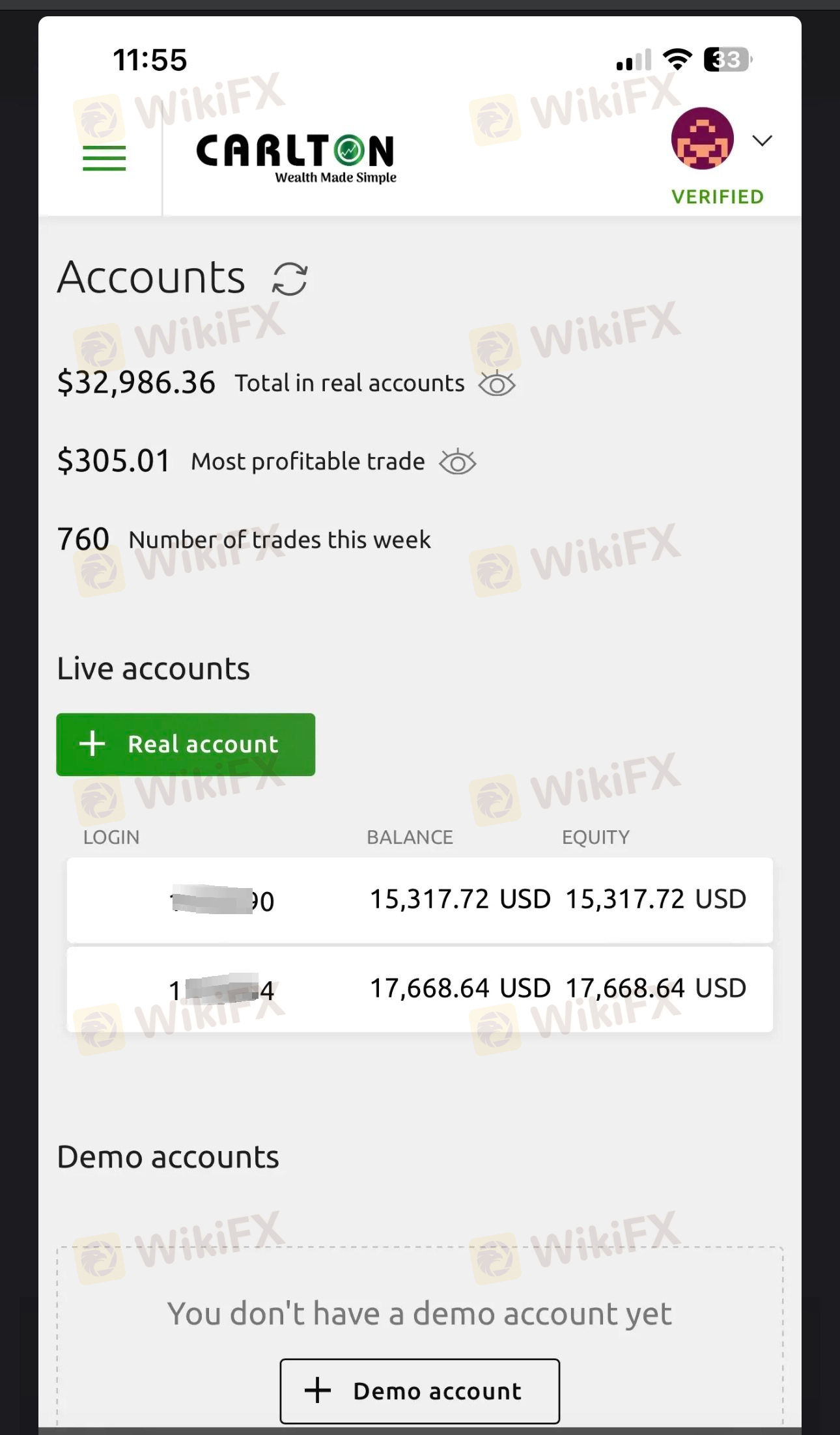 Except for a demo account with virtual money to practice before commiting real money, CARLTON offers a 5 tiered live accounts for clients to choose from.