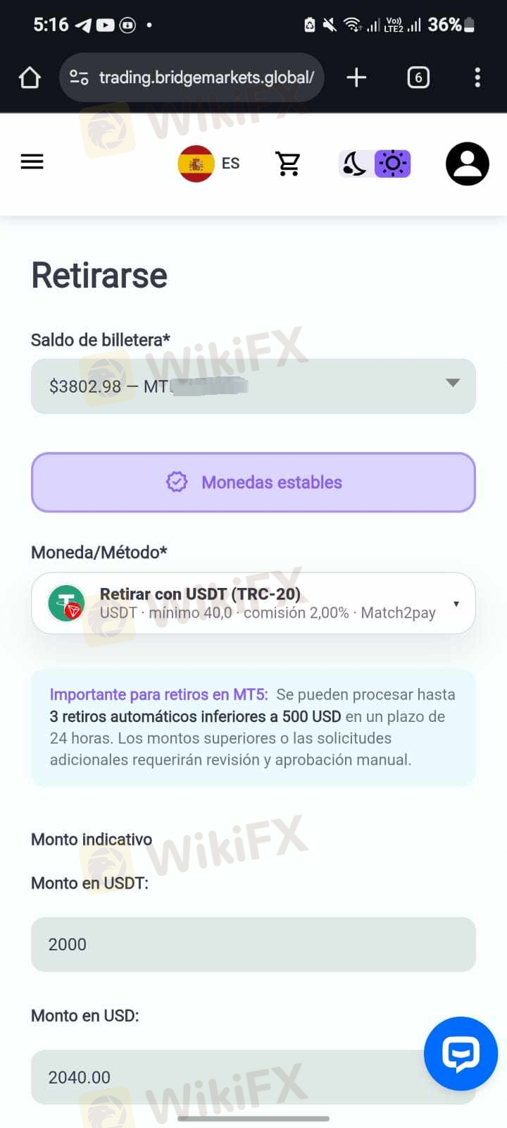 Hello, good evening. I am writing to this brokerage firm, BridgeMarket, which is a complete scam. They are not paying my trading account, which had $497 USDT. I brought it to $3,497 in about 20 days. They say that I violated the rules by using high-frequency trading bots or high-frequency strategies, but that is not the case.