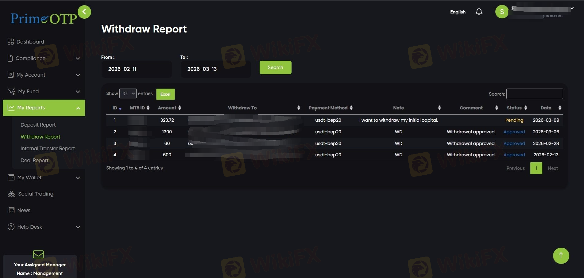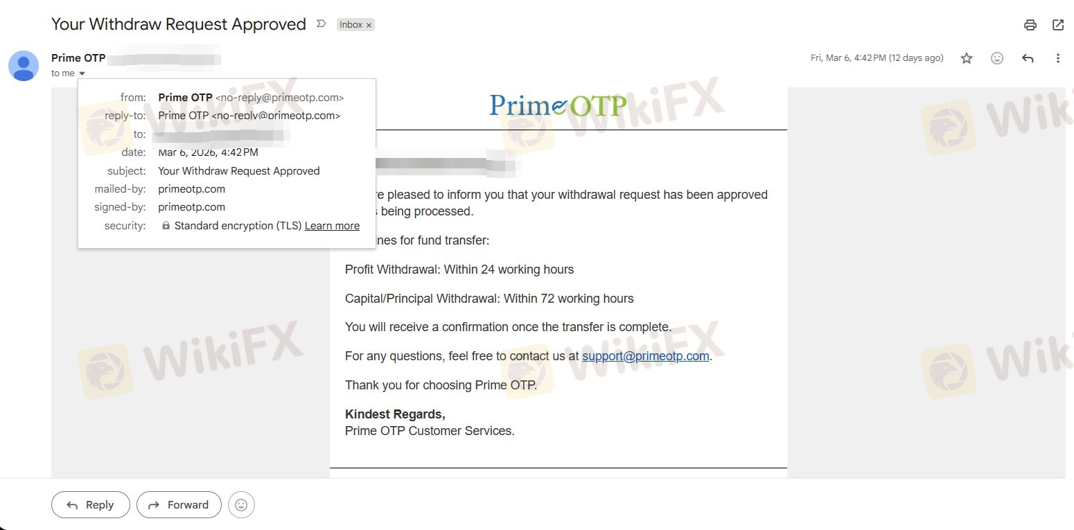 Important operational information such as processing time, minimum or maximum deposit amounts, withdrawal limits, and possible transaction fees is also not disclosed. Many brokers in the industry clearly specify these points, as they influence how efficiently users can manage their trading funds. Without this information, users can only rely on the list of supported Prime OTP deposit and withdrawal channels, but cannot fully assess the cost structure or expected processing speed.