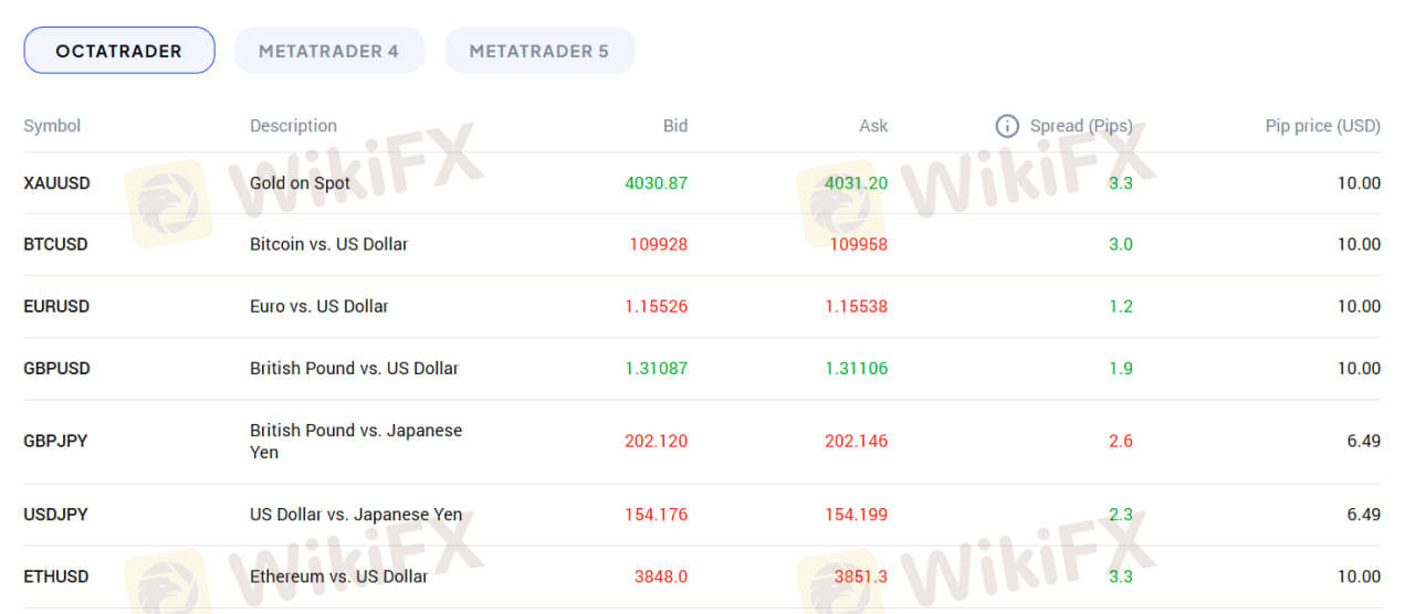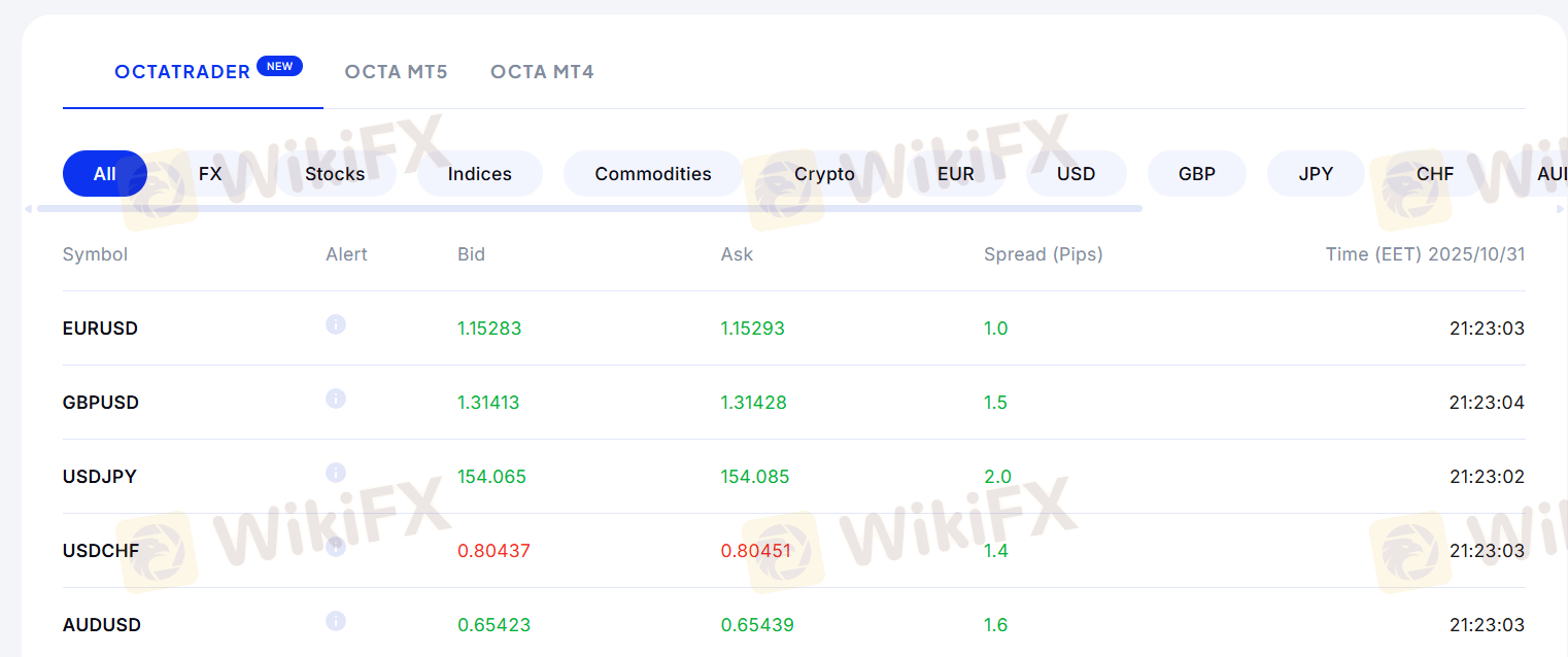 Octa offers trading in currrency pairs, gold/silver, commodities, indices, and cryptos.