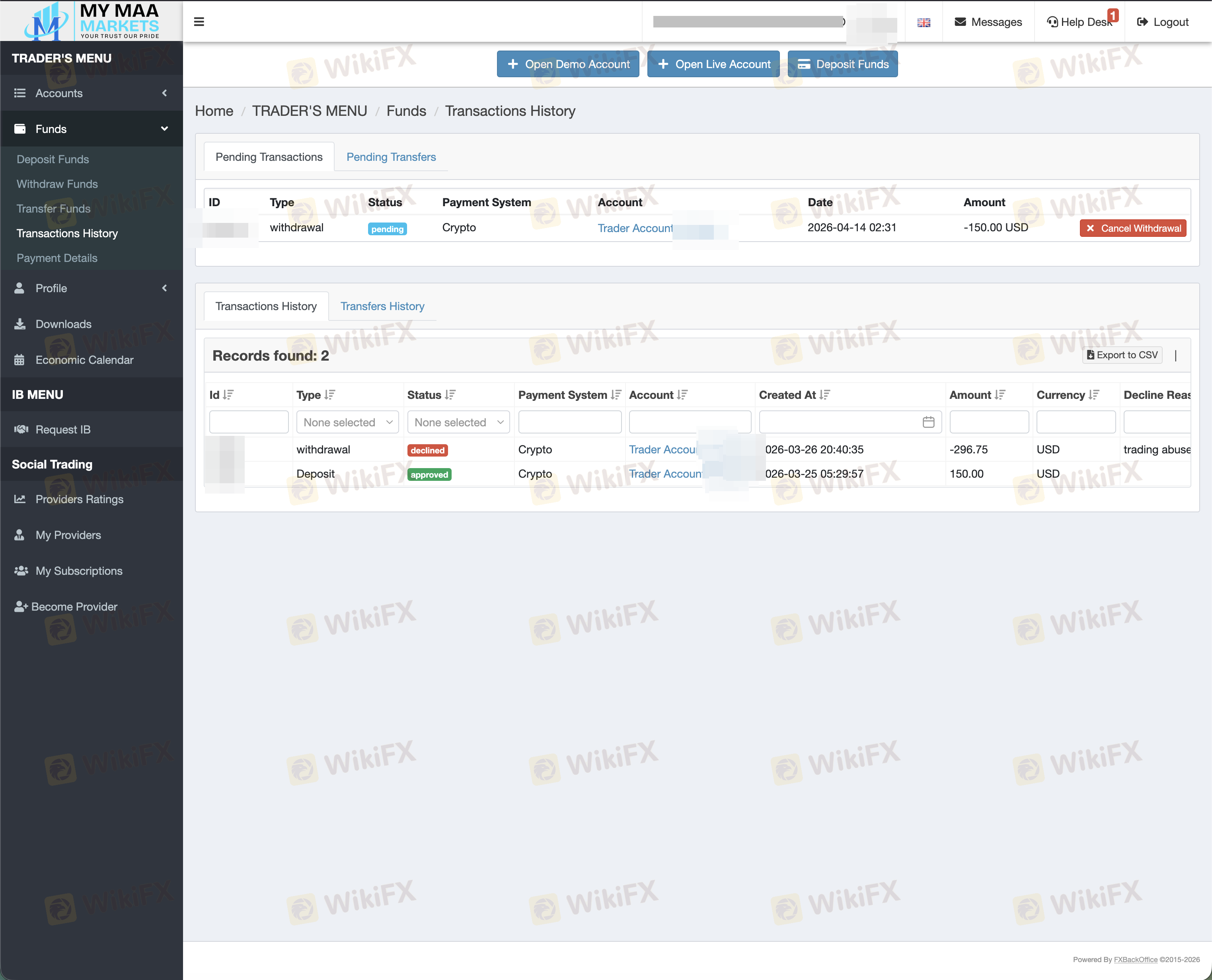 MY MAA MARKETS supports deposits via VISA, MasterCard, PayPal, bank transfer, Neteller, Skrill, etc., with instant account crediting. Withdrawals use the same deposit channels, are processed within 2 hours, and incur no fees. The default account currency is US dollars.
