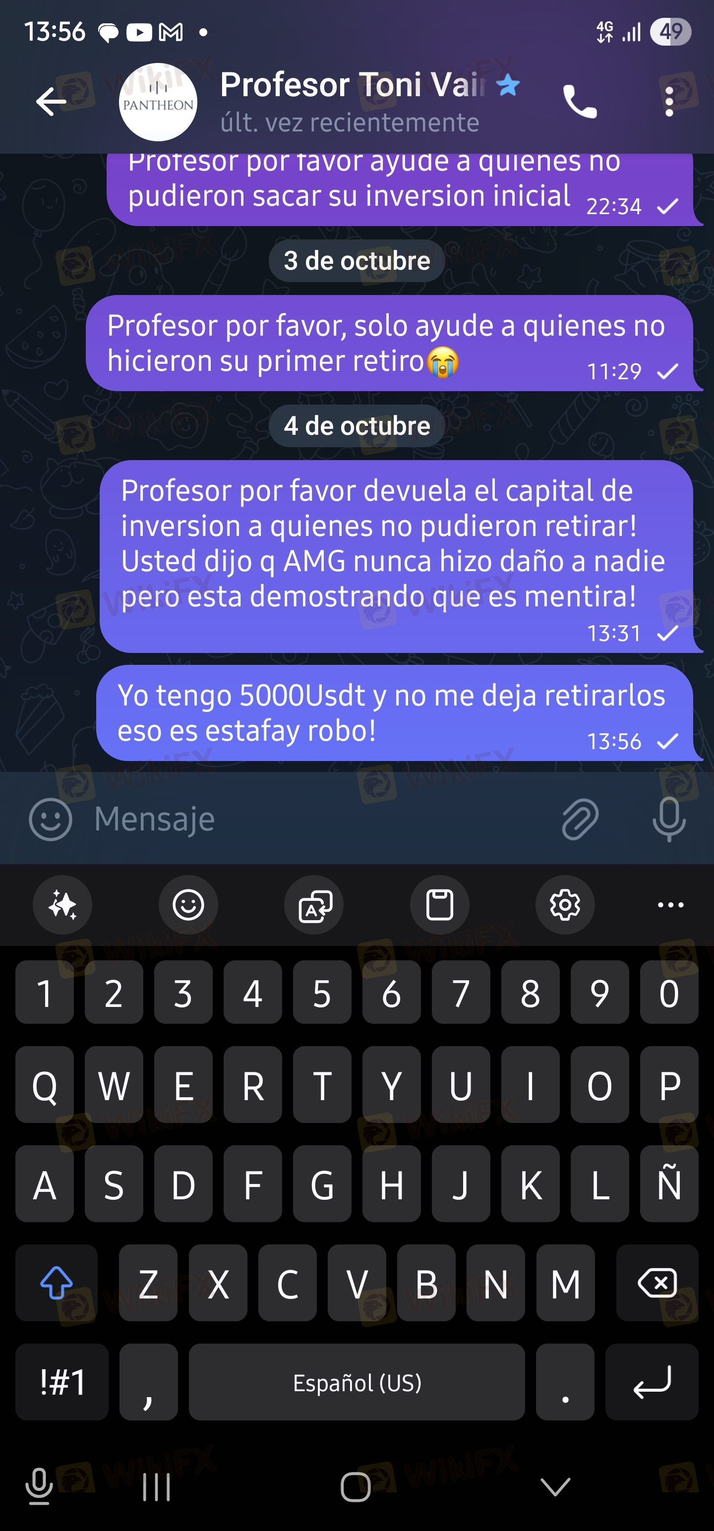 For the past few months, I've been doing copy trading on an app called AMG. I managed to accumulate 5000 USDT in the app. However, for the past week, I haven't been able to withdraw any of the 5000 USDT, not even a portion, and now they've blocked me from the app and removed me from the Telegram groups where they used to send trading signals. I've lost everything, and I desperately need the money for my wife's spinal treatment. I'm pleading for help—I'm writing from Bolivia :'(