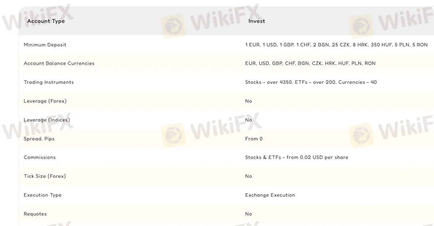 A live account with a minimum deposit of 1 EUR, 1 USD, 1 GBP, 1 CHF, 2 BGN, 25 CZK, 8 HRK, 350 HUF, 5 PLN, 5 RON is also available. Spread is tight from 0 pips and commission is from 0.02 USD per share for stocks and ETFs.