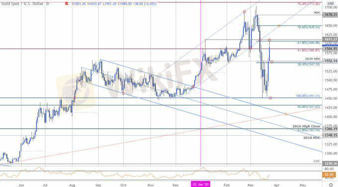 Gold prices surged more than 11% off the lows with a three-day rally taking XAU/USD into the first major hurdle at downtrend resistance. The immediate advance may be vulnerable here but IF gold has turned the corner, losses should be limited to the weekly open.