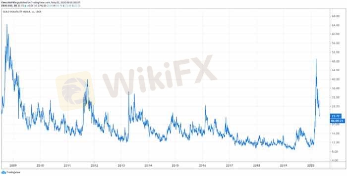 Gold volatility (as measured by the Cboe’s gold volatility ETF, GVZ, which tracks the 1-month implied volatility of gold as derived from the GLD option chain) is trading at 23.72, breaking its coronavirus pandemic low set on March 16 at 23.96. It’s worth noting that, despite gold volatility breaking its coronavirus pandemic lows, gold prices have not: gold prices were trading at 1696.94 at the time this report was written; on March 16, gold prices traded as low as 1451.43.