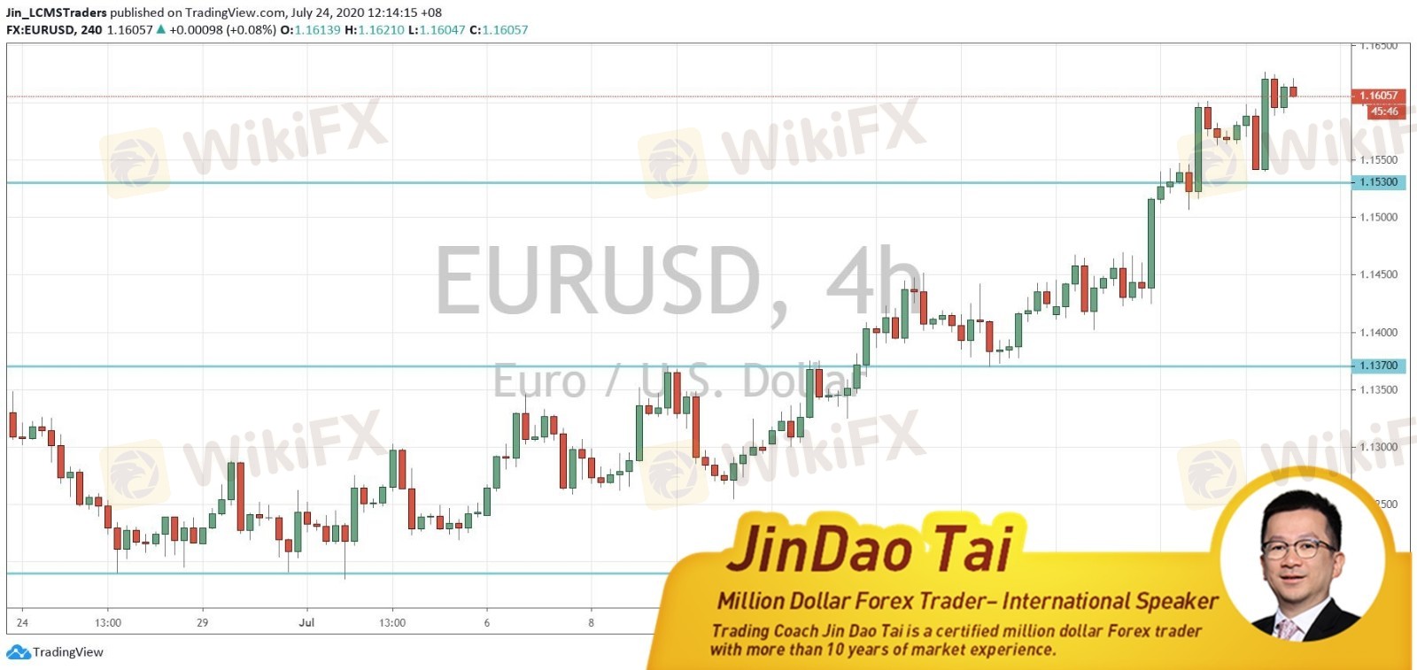 Overall, EUR/USD is trending upwards. Recently, EUR/USD bounced off the support zone of 1.15300.