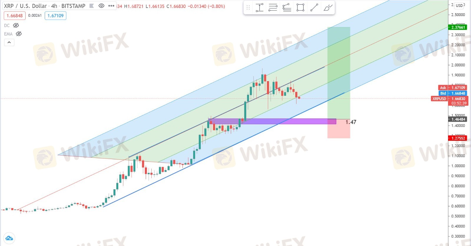 XRP telah membentuk channel ascending dan retracement SELL sedang berlaku untuk cuba menembusi zon harga 1.47 sebagai SnR, Demand zon dan juga confluence bersama bottom channel trendline.