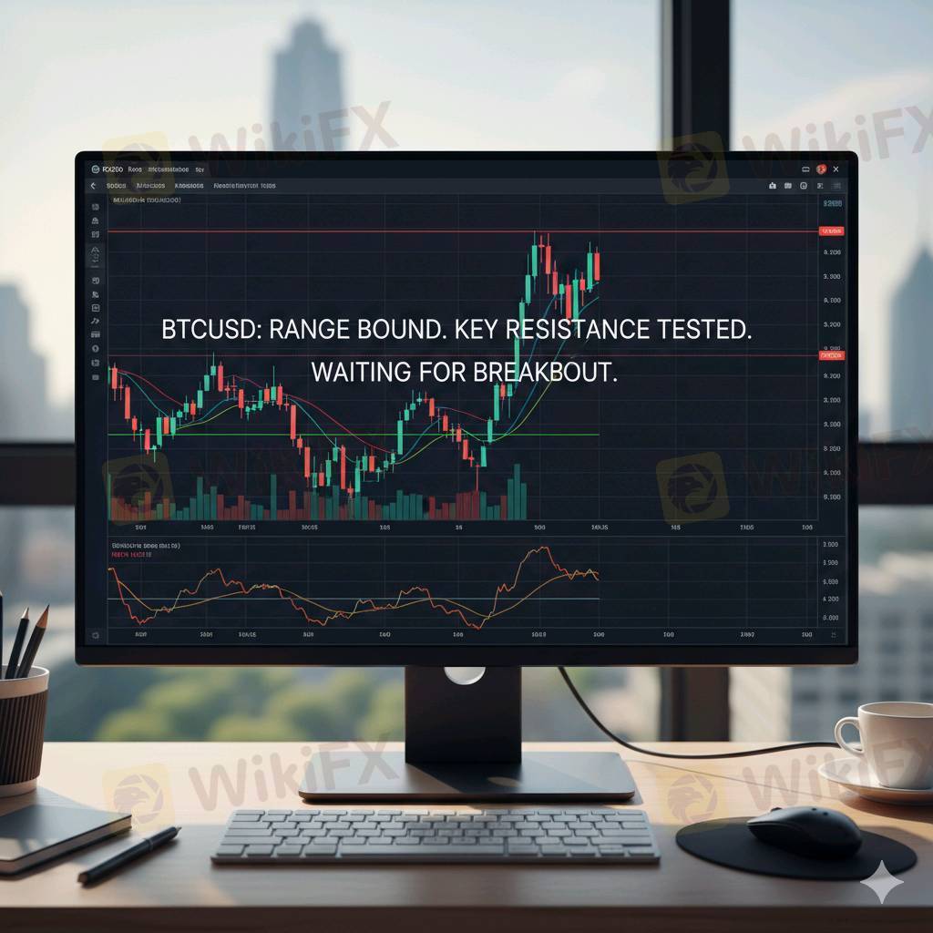 BTCUSD is currently trading within a defined range, exhibiting indecisive price action. Key resistance levels are being tested, and a clear break above these could signal a continuation of the recent upward trend. Conversely, a failure to hold current support could lead to further downside. Traders are closely watching for a decisive move to confirm the next direction.