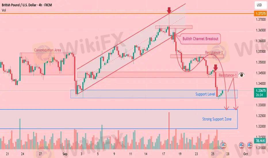 Analysis: Currently, GBPUSD is trading near the 1.33600 area, which aligns with a key support zone. Price has also broken out of its bullish parallel channel, showing bearish pressure on the 4H timeframe.