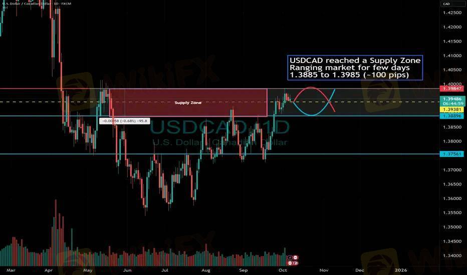 USDCAD has been trading in a ranging market over the past few sessions, consolidating after a strong bullish extension that began from the key level 1.3760 on September 25. This upward move has now brought price into a well-defined Supply Zone between 1.3885 and 1.3985, a 100-pip band that historically attracts selling pressure.