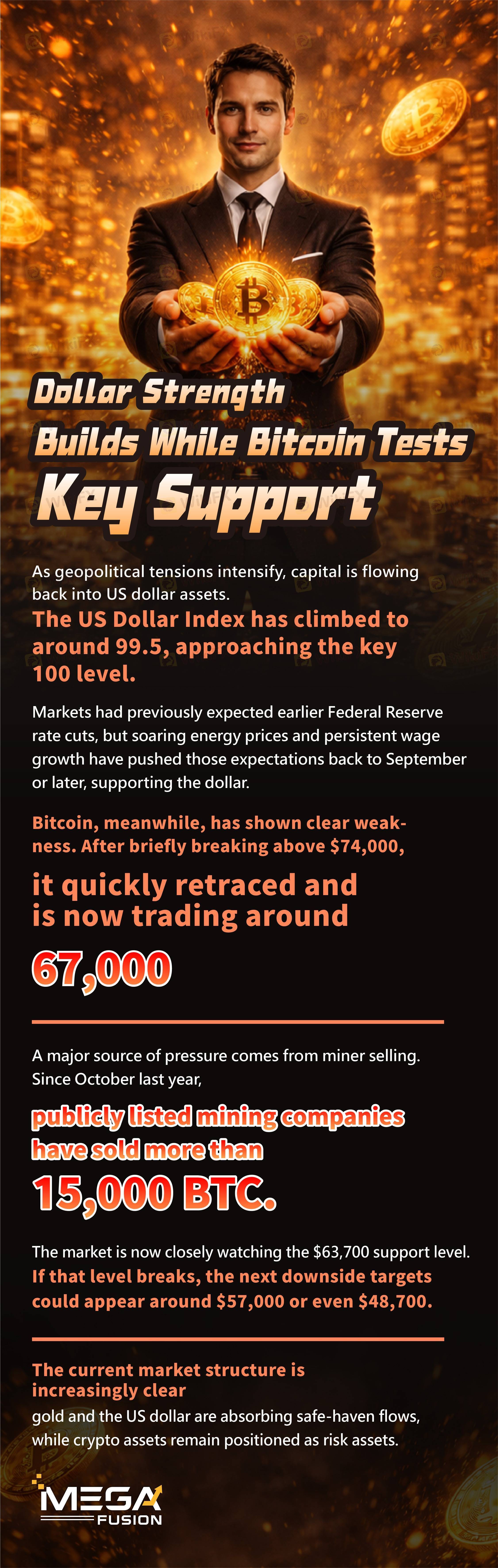 Rising geopolitical tensions and macroeconomic uncertainty have led to renewed demand for U.S. dollar assets, pushing the U.S. Dollar Index (DXY) toward the key 100 level, currently trading around 99.5.Market expectations for Federal Reserve rate cuts have been pushed further out, as elevated energy prices and resilient wage growth continue to raise concerns about persistent inflation pressures.In contrast, Bitcoin has shown signs of weakness. After briefly rallying above $74,000, the cryptocurrency quickly retraced and is now trading near $67,000.A major source of selling pressure has come from publicly listed mining companies, which have collectively sold more than 15,000 BTC since October, adding supply to the market.Investors are closely monitoring the $63,700 support level. A breakdown below this threshold could open the door to further downside targets around $57,000 or even $48,700.Current market dynamics suggest a clear divergence:gold and the U.S. dollar are attracting safe-haven flows, while crypto assets remain more sensitive to risk sentiment.