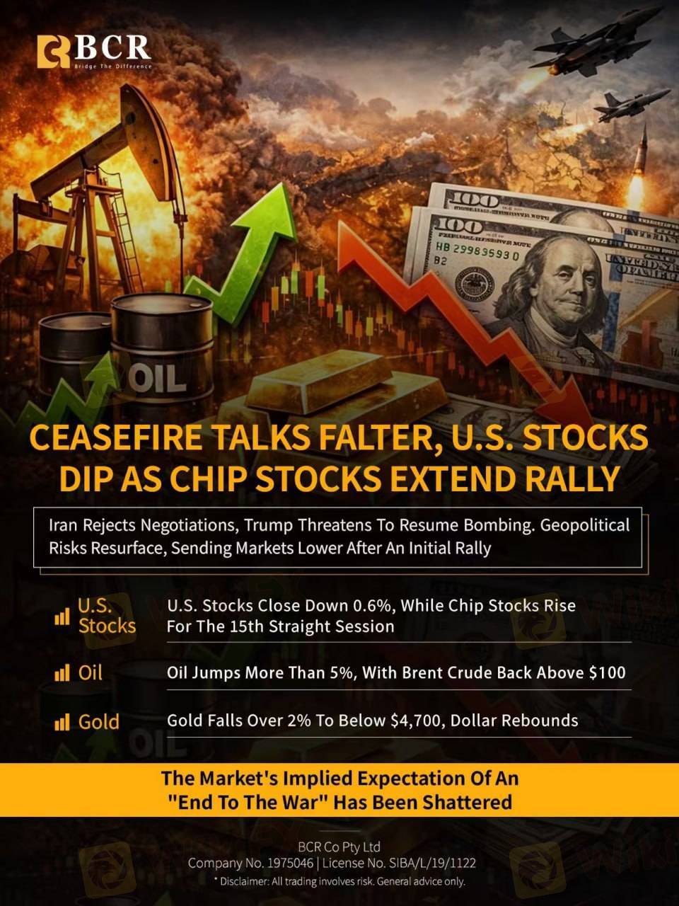 Geopolitical risks resurface. Oil +5%, chip stocks extend rally, gold sinks. Markets reacting fast. Stay sharp. #thebcr #bcrTrading #bcrGlobal