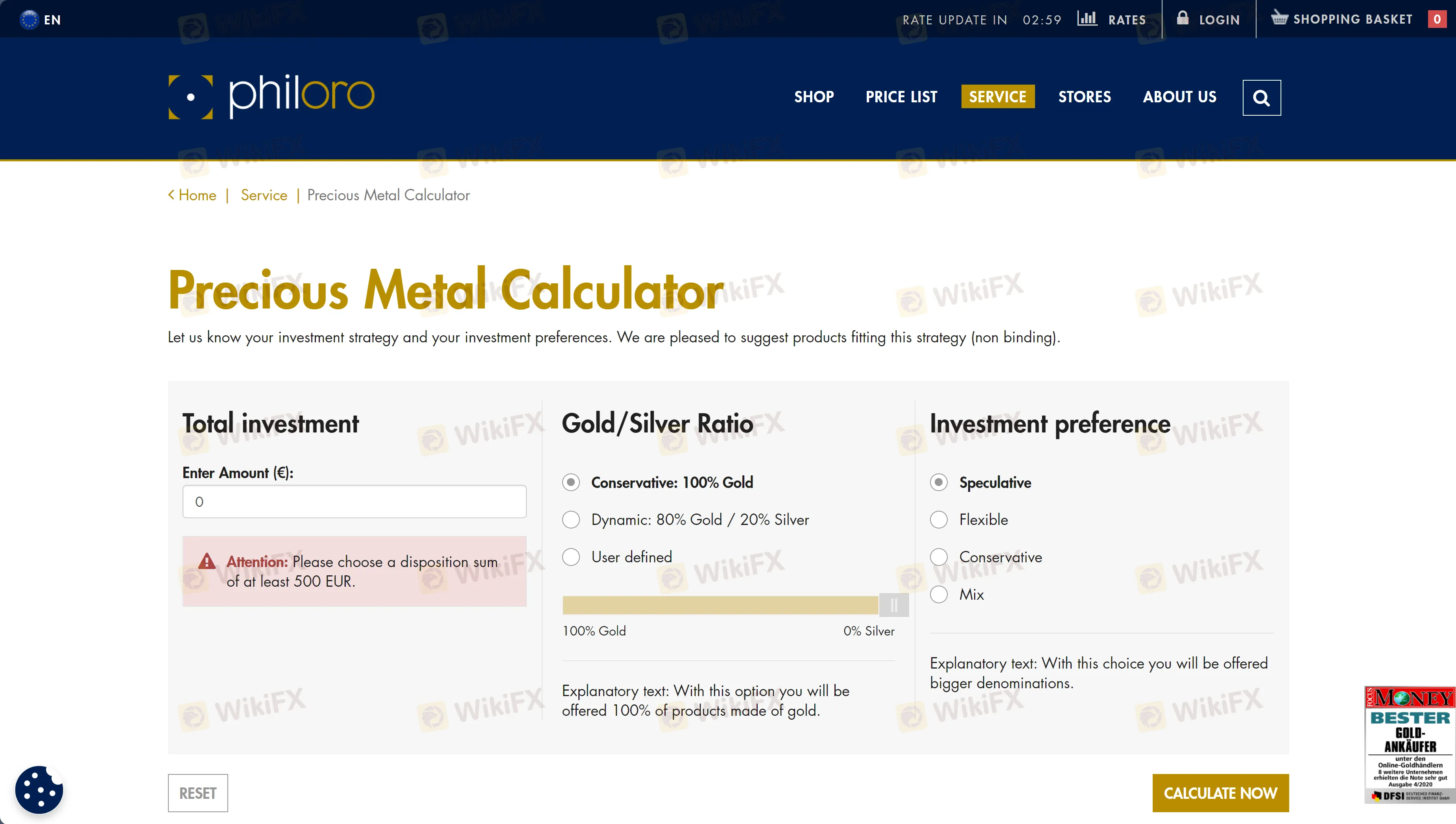 Precious Metal Calculator: To assist clients in evaluating their investments and potential returns, Philoro offers a precious metal calculator. This tool helps in estimating the value of precious metal holdings based on current market prices, aiding in portfolio management and investment planning.
