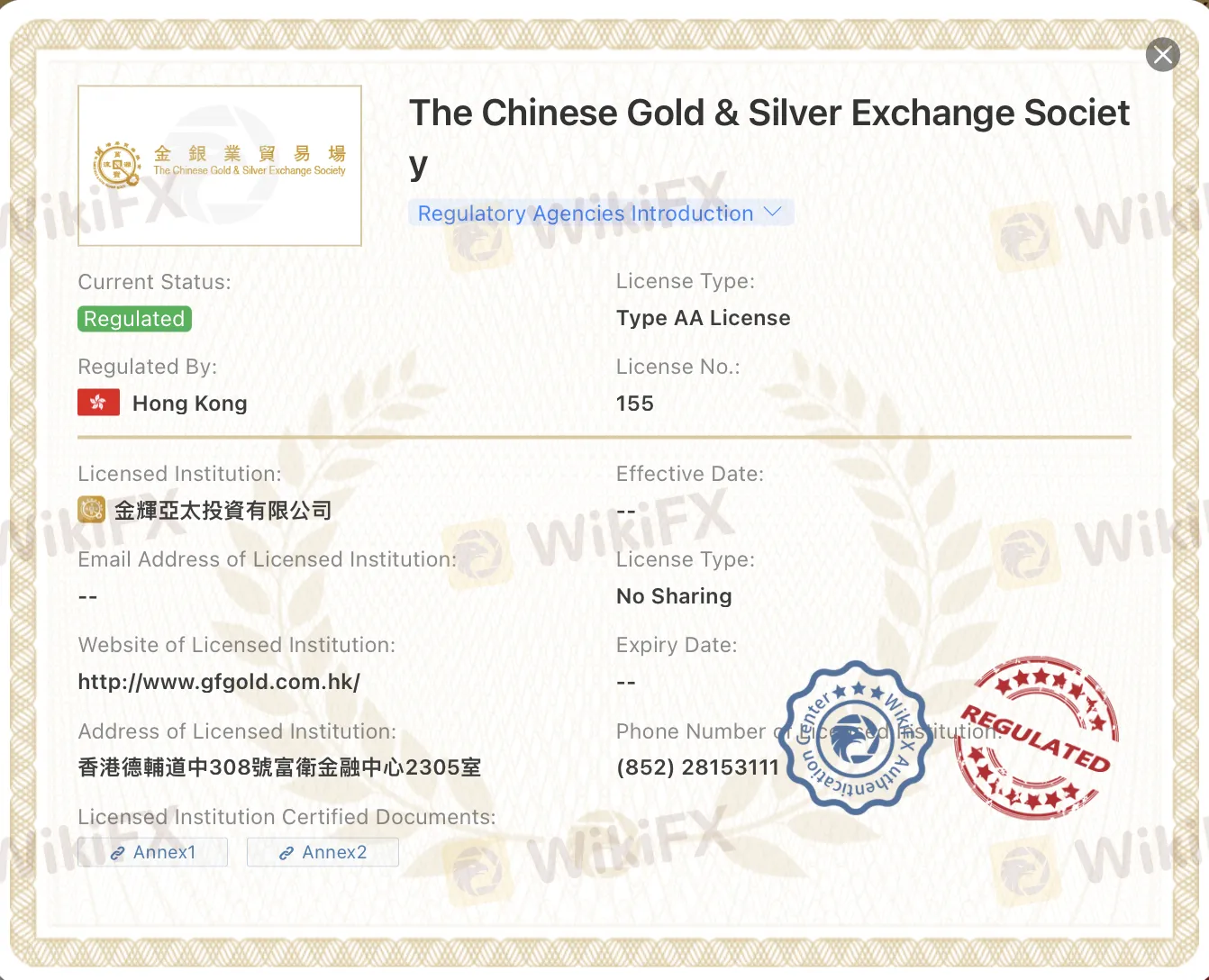 GF is regulated by the Chinese Gold & Silver Exchange Society, holding a Type AA License with License No. 155 under the licensed institution 金輝亞太投資有限公司 in Hong Kong. The current regulated status reflects a commitment to adhering to established regulatory standards, providing a structured and secure trading environment.