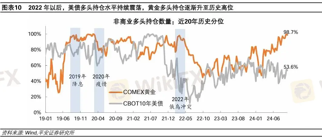 Against the backdrop of the Fed's interest rate cuts, gold is more attractive than U.S. Treasuries in this round, making it likely to perform more strongly. However, gold prices may face certain adjustment risks in the short term. First, bullish gold positions continue to be crowded, and “fear of heights” may affect the sustainability of gold price increases. The proportion of non-commercial long positions in COMEX gold has remained above 60% since June. In the past two decades, the proportion has not been above 60% for many times, and the longest period has not exceeded 4 months. Secondly, the recent rebound in U.S. Treasury bond interest rates has gradually accumulated pressure on gold prices. Although the correlation between gold prices and U.S. Treasury (real) interest rates is not as good as before, it has not disappeared.