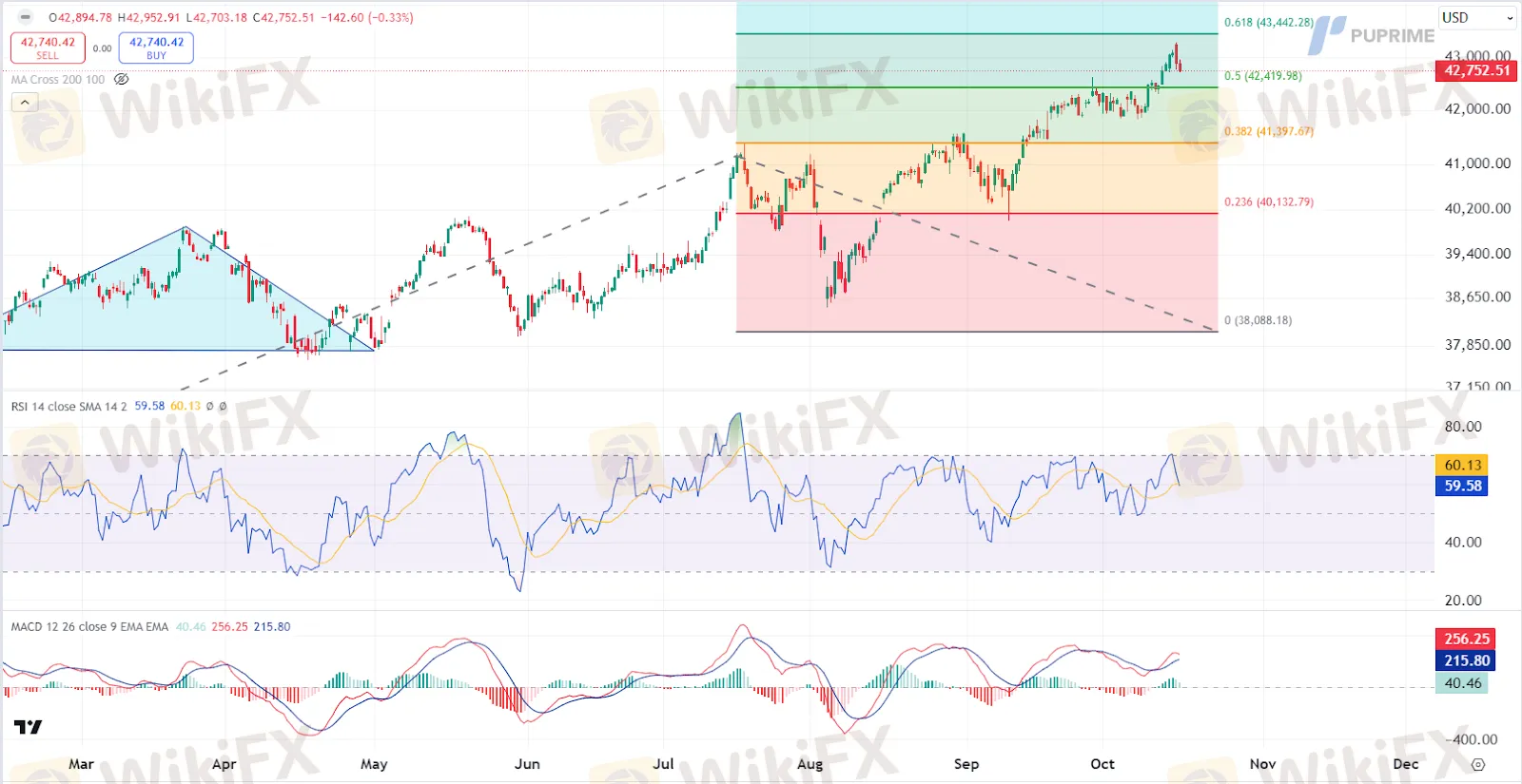 The Dow is trading lower following the prior retracement from the resistance level. MACD has illustrated diminishing bullish momentum, while RSI is at 60, suggesting the index might extend its losses since the RSI retreated sharply from overbought territory.