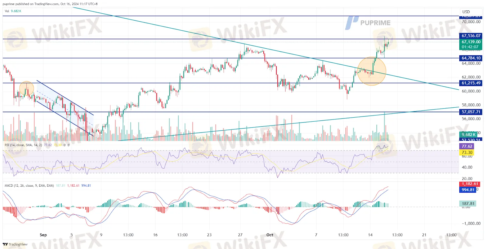 Bitcoin (BTC) continues to surge, breaking above its downtrend resistance level and reaching the $67,000 mark for the first time since July. The crypto market has been widely encouraged by a more favourable stance from the U.S. government, as both presidential candidates, Kamala Harris and Donald Trump, have explicitly shown support for the crypto market ecosystem. This political backing has fueled increased buying pressure across the crypto market, boosting investor confidence and driving the price of BTC higher.