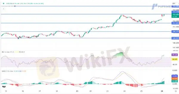 USD/JPY is trading higher while currently testing the resistance level. MACD has illustrated increasing bullish momentum. However, RSI is at 82, suggesting the pair might enter overbought territory.