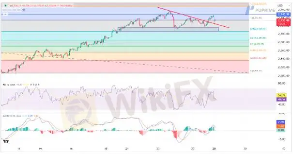 The Dollar Index is trading higher following the prior rebound from the support level. MACD has illustrated diminishing bearish momentum, while RSI is at 65, suggesting the index might extend its gains since the RSI stays above the midline.