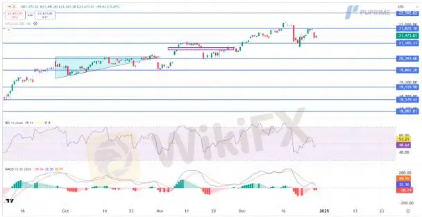 Nasdaq is trading lower following the prior retracement from the resistance level. MACD has illustrated increasing bearish momentum, while RSI is at 49, suggesting the index might extend its losses since the RSI stays below the midline.