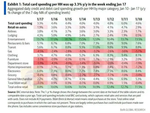 In his analysis Bhave used the latest BofA aggregated credit and debit card data (report available to pro subs) to zoom in on the effect of Viola. Total card spending was down 3.7% y/y in the week ending February 19, 2021, compared to a trend of about +6% y/y in prior weeks.