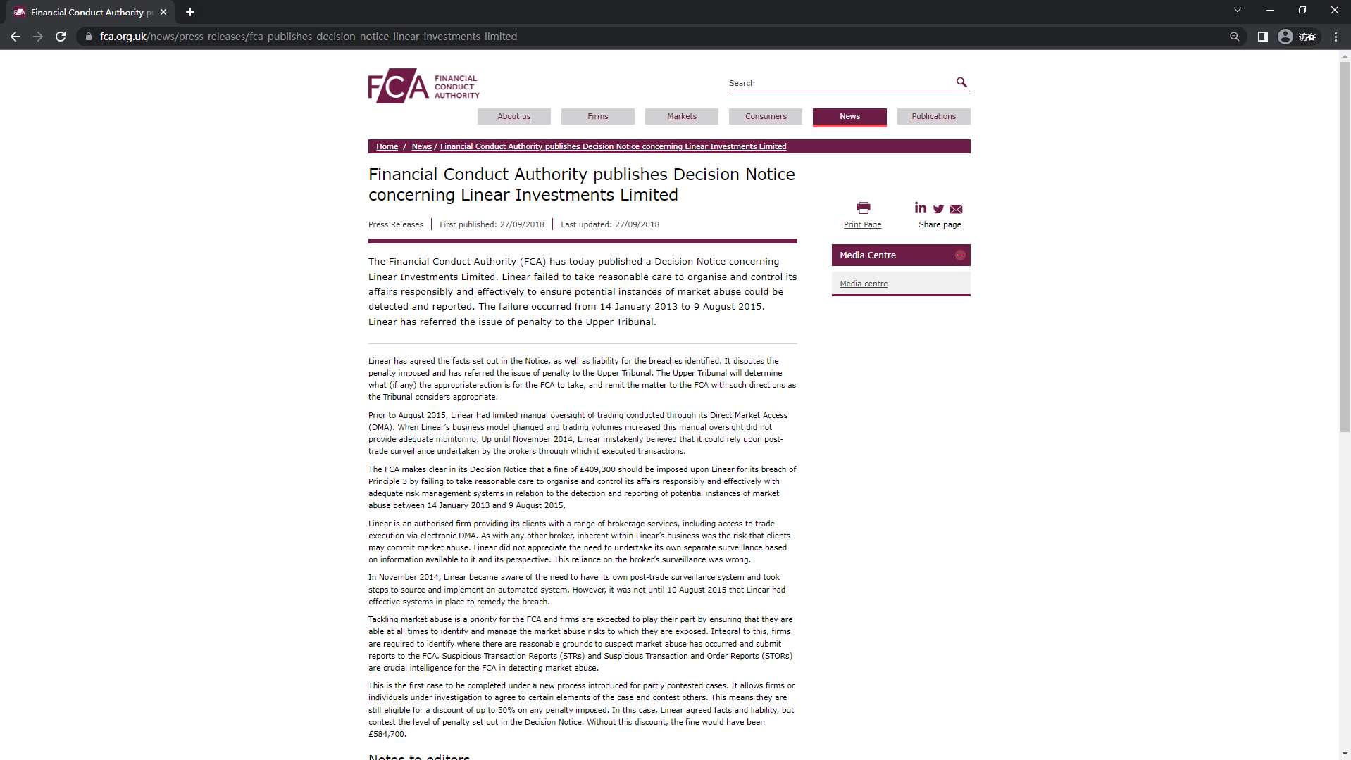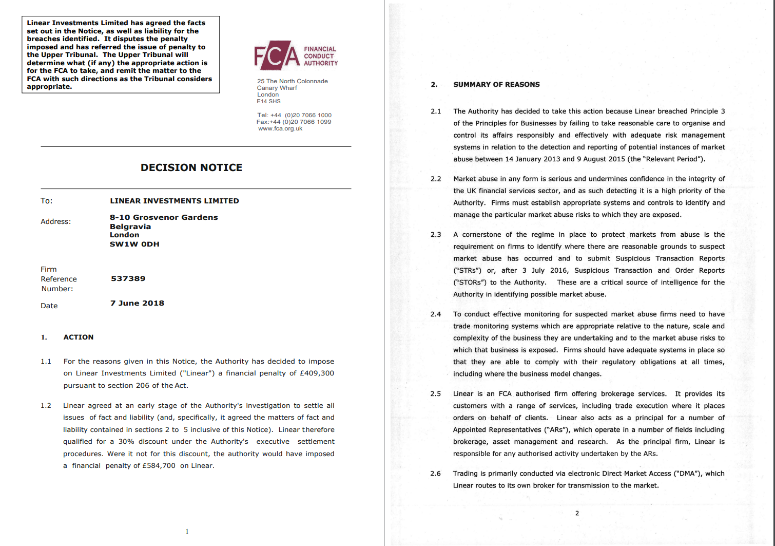 Linear has agreed the facts set out in the Notice, as well as liability for the breaches identified. It disputes the penalty imposed and has referred the issue of penalty to the Upper Tribunal. The Upper Tribunal will determine what (if any) the appropriate action is for the FCA to take, and remit the matter to the FCA with such directions as the Tribunal considers appropriate.