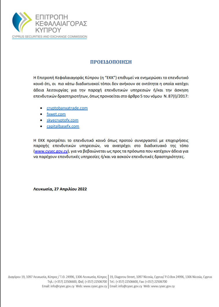 WARNING The Cyprus Securities and Exchange Commission (‘CySEC’) wishes to inform investors that the following websites do not belong to an entity which has been granted an authorization for the provision of investment services and/or the performance of investment activities, as provided for in Article 5 of Law 87 (I)/2017.  cryptobanxatrade.com  fxwet.com  skyecryptofx.com  capitalbasefx.com CySEC urges investors to consult its website (www.cysec.gov.cy), before conducting business with investment firms, in order to ascertain the entities which are licensed to provide investment services and/or investment activities. Nicosia, 27 April 2022