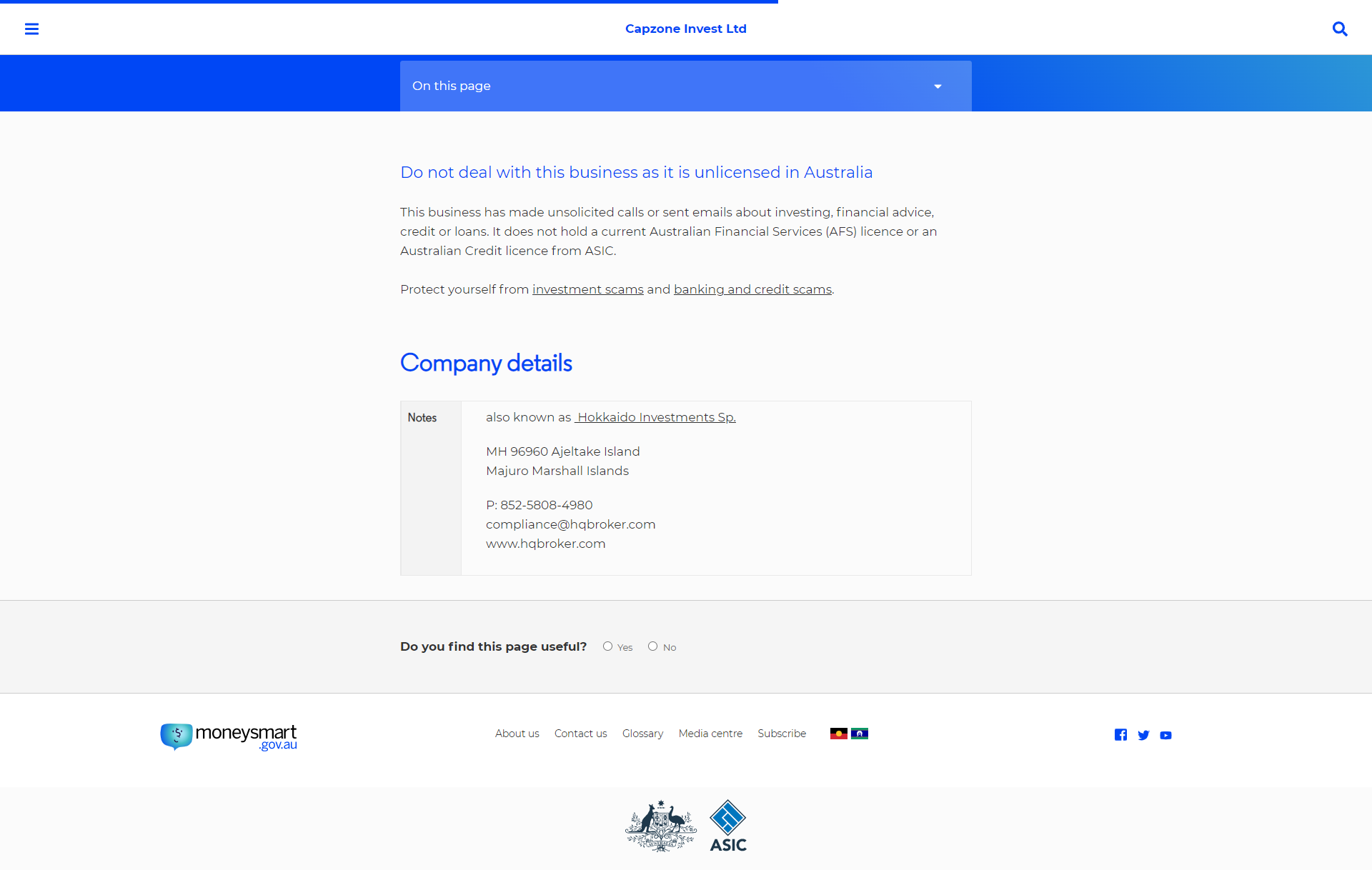 Capzone Invest Ltd ASIC advises this company could be involved in a scam PAGE READING TIME:1 MINUTE On this page Do not deal with this business as it is unlicensed in Australia This business has made unsolicited calls or sent emails about investing, financial advice, credit or loans. It does not hold a current Australian Financial Services (AFS) licence or an Australian Credit licence from ASIC. Protect yourself from investment scams and banking and credit scams. Company details Notes also known as Hokkaido Investments Sp. MH 96960 Ajeltake Island Majuro Marshall Islands P: 852-5808-4980 compliance@hqbroker.com www.hqbroker.com