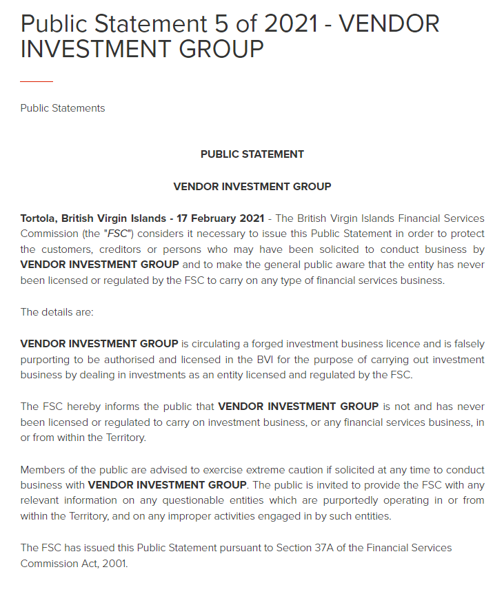 Public Statement 5 of 2021 - VENDOR INVESTMENT GROUP Public Statements PUBLIC STATEMENT VENDOR INVESTMENT GROUP Tortola, British Virgin Islands - 17 February 2021 - The British Virgin Islands Financial Services Commission (the "FSC") considers it necessary to issue this Public Statement in order to protect the customers, creditors or persons who may have been solicited to conduct business by VENDOR INVESTMENT GROUP and to make the general public aware that the entity has never been licensed or regulated by the FSC to carry on any type of financial services business. The details are: VENDOR INVESTMENT GROUP is circulating a forged investment business licence and is falsely purporting to be authorised and licensed in the BVI for the purpose of carrying out investment business by dealing in investments as an entity licensed and regulated by the FSC. The FSC hereby informs the public that VENDOR INVESTMENT GROUP is not and has never been licensed or regulated to carry on investment business, or any financial services business, in or from within the Territory. Members of the public are advised to exercise extreme caution if solicited at any time to conduct business with VENDOR INVESTMENT GROUP. The public is invited to provide the FSC with any relevant information on any questionable entities which are purportedly operating in or from within the Territory, and on any improper activities engaged in by such entities. The FSC has issued this Public Statement pursuant to Section 37A of the Financial Services Commission Act, 2001.
