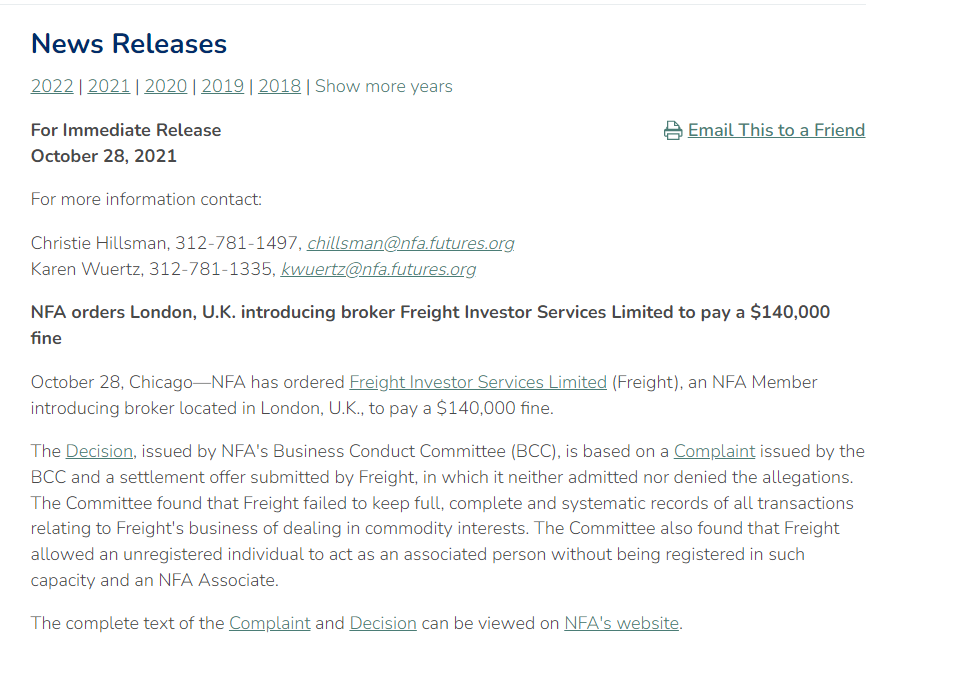 The Decision, issued by NFA's Business Conduct Committee (BCC), is based on a Complaint issued by the BCC and a settlement offer submitted by Freight, in which it neither admitted nor denied the allegations. The Committee found that Freight failed to keep full, complete and systematic records of all transactions relating to Freight's business of dealing in commodity interests. The Committee also found that Freight allowed an unregistered individual to act as an associated person without being registered in such capacity and an NFA Associate.
