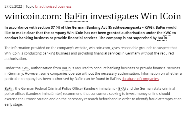 27.05.2022 | Topic Unauthorised business winicoin.com: BaFin investigates Win ICoin In accordance with section 37 (4) of the German Banking Act (Kreditwesengesetz – KWG), BaFin would like to make clear that the company Win ICoin has not been granted authorisation under the KWG to conduct banking business or provide financial services. The company is not supervised by BaFin. The information provided on the company’s website, winicoin.com, gives reasonable grounds to suspect that Win ICoin is conducting banking business and providing financial services in Germany without the required authorisation. Under the KWG, authorisation from BaFin is required to conduct banking business or provide financial services in Germany. However, some companies operate without the necessary authorisation. Information on whether a particular company has been authorised by BaFin can be found in BaFin’s database of companies. BaFin, the German Federal Criminal Police Office (Bundeskriminalamt – BKA) and the German state criminal police offices (Landeskriminalämter) recommend that consumers seeking to invest money online should exercise the utmost caution and do the necessary research beforehand in order to identify fraud attempts at an early stage.