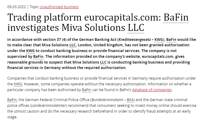09.03.2022 | Topic Unauthorised business Trading platform eurocapitals.com: BaFin investigates Miva Solutions LLC In accordance with section 37 (4) of the German Banking Act (Kreditwesengesetz – KWG), BaFin would like to make clear that Miva Solutions LLC, London, United Kingdom, has not been granted authorisation under the KWG to conduct banking business or provide financial services. The company is not supervised by BaFin. The information provided on the company’s website, eurocapitals.com, gives reasonable grounds to suspect that Miva Solutions LLC is conducting banking business and providing financial services in Germany without the required authorisation. Companies that conduct banking business or provide financial services in Germany require authorisation under the KWG. However, some companies operate without the necessary authorisation. Information on whether a particular company has been authorised by BaFin can be found in BaFin’s database of companies. BaFin, the German Federal Criminal Police Office (Bundeskriminalamt – BKA) and the German state criminal police offices (Landeskriminalämter) recommend that consumers seeking to invest money online should exercise the utmost caution and do the necessary research beforehand in order to identify fraud attempts at an early stage.