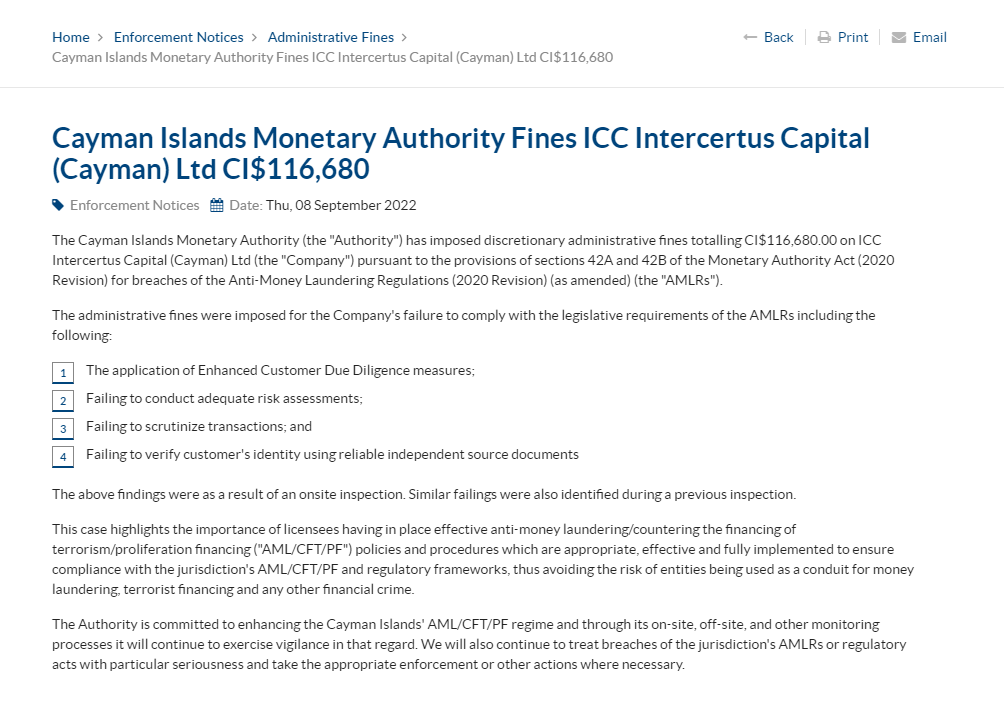 Cayman Islands Monetary Authority Fines ICC Intercertus Capital (Cayman) Ltd CI$116,680 Enforcement Notices Date: Thu, 08 September 2022 The Cayman Islands Monetary Authority (the "Authority") has imposed discretionary administrative fines totalling CI$116,680.00 on ICC Intercertus Capital (Cayman) Ltd (the "Company") pursuant to the provisions of sections 42A and 42B of the Monetary Authority Act (2020 Revision) for breaches of the Anti-Money Laundering Regulations (2020 Revision) (as amended) (the "AMLRs"). The administrative fines were imposed for the Company's failure to comply with the legislative requirements of the AMLRs including the following: The application of Enhanced Customer Due Diligence measures; 1. Failing to conduct adequate risk assessments; 2. Failing to scrutinize transactions; and 3. Failing to verify customer's identity using reliable independent source documents 4. The above findings were as a result of an onsite inspection. Similar failings were also identified during a previous inspection. This case highlights the importance of licensees having in place effective anti-money laundering/countering the financing of terrorism/proliferation financing ("AML/CFT/PF") policies and procedures which are appropriate, effective and fully implemented to ensure compliance with the jurisdiction's AML/CFT/PF and regulatory frameworks, thus avoiding the risk of entities being used as a conduit for money laundering, terrorist financing and any other financial crime. The Authority is committed to enhancing the Cayman Islands' AML/CFT/PF regime and through its on-site, off-site, and other monitoring processes it will continue to exercise vigilance in that regard. We will also continue to treat breaches of the jurisdiction's AMLRs or regulatory acts with particular seriousness and take the appropriate enforcement or other actions where necessary.