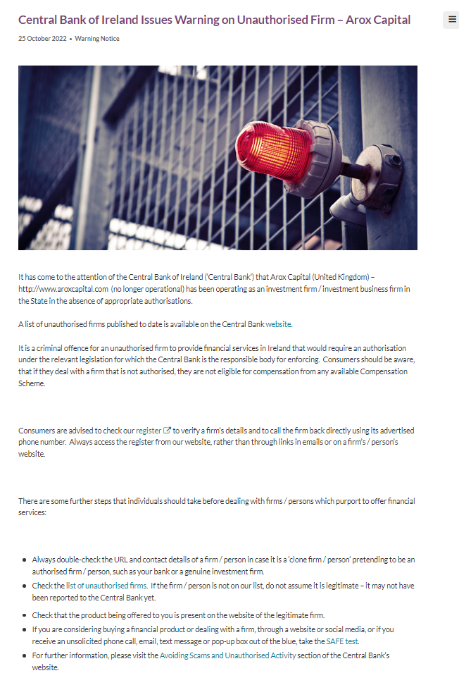 It has come to the attention of the Central Bank of Ireland (‘Central Bank’) that Arox Capital (United Kingdom) – http://www.aroxcapital.com (no longer operational) has been operating as an investment firm / investment business firm in the State in the absence of appropriate authorisations.