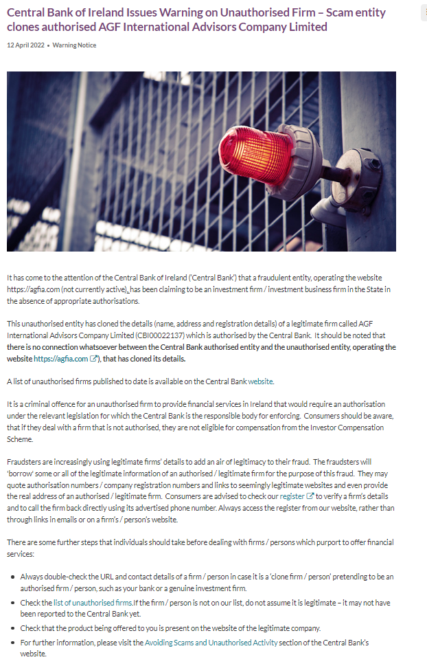 Central Bank of Ireland Issues Warning on Unauthorised Firm – Scam entity clones authorised AGF International Advisors Company Limited