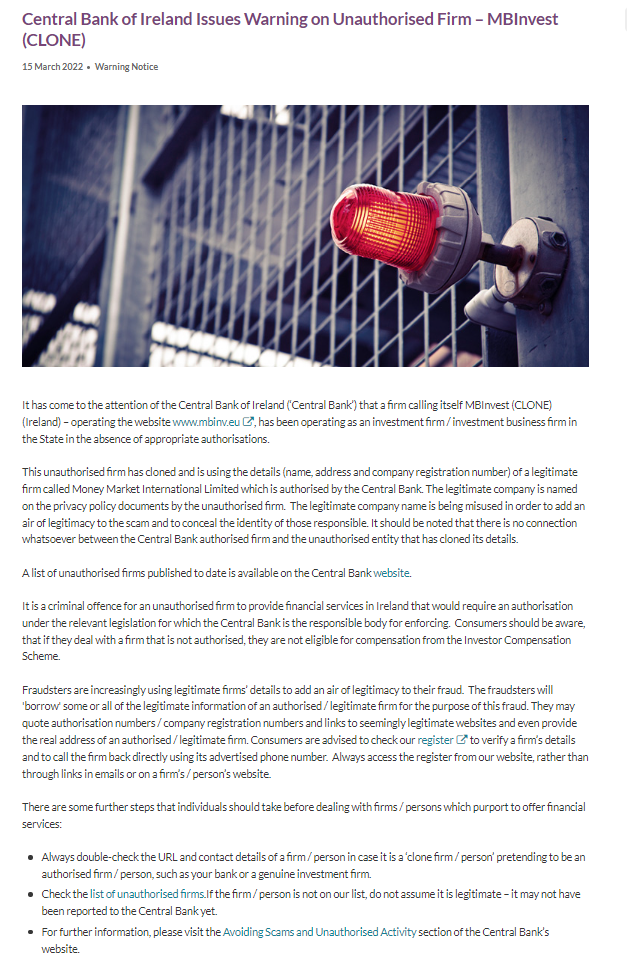 15 March 2022 Warning Notice Warning It has come to the attention of the Central Bank of Ireland (‘Central Bank’) that a firm calling itself MBInvest (CLONE) (Ireland) – operating the website www.mbinv.eu, has been operating as an investment firm / investment business firm in the State in the absence of appropriate authorisations. This unauthorised firm has cloned and is using the details (name, address and company registration number) of a legitimate firm called Money Market International Limited which is authorised by the Central Bank. The legitimate company is named on the privacy policy documents by the unauthorised firm. The legitimate company name is being misused in order to add an air of legitimacy to the scam and to conceal the identity of those responsible. It should be noted that there is no connection whatsoever between the Central Bank authorised firm and the unauthorised entity that has cloned its details. A list of unauthorised firms published to date is available on the Central Bank website. It is a criminal offence for an unauthorised firm to provide financial services in Ireland that would require an authorisation under the relevant legislation for which the Central Bank is the responsible body for enforcing. Consumers should be aware, that if they deal with a firm that is not authorised, they are not eligible for compensation from the Investor Compensation Scheme. Fraudsters are increasingly using legitimate firms’ details to add an air of legitimacy to their fraud. The fraudsters will 'borrow' some or all of the legitimate information of an authorised / legitimate firm for the purpose of this fraud. They may quote authorisation numbers / company registration numbers and links to seemingly legitimate websites and even provide the real address of an authorised / legitimate firm. Consumers are advised to check our register to verify a firm’s details and to call the firm back directly using its advertised phone number. Always access the register from our website, rather than through links in emails or on a firm’s / person’s website. There are some further steps that individuals should take before dealing with firms / persons which purport to offer financial services: Always double-check the URL and contact details of a firm / person in case it is a ‘clone firm / person’ pretending to be an authorised firm / person, such as your bank or a genuine investment firm. Check the list of unauthorised firms.If the firm / person is not on our list, do not assume it is legitimate – it may not have been reported to the Central Bank yet. For further information, please visit the Avoiding Scams and Unauthorised Activity section of the Central Bank’s website. Any person wishing to contact the Central Bank with information regarding such firms / persons may telephone (01) 224 4000. This line is also available to the public to check if a firm is authorised.